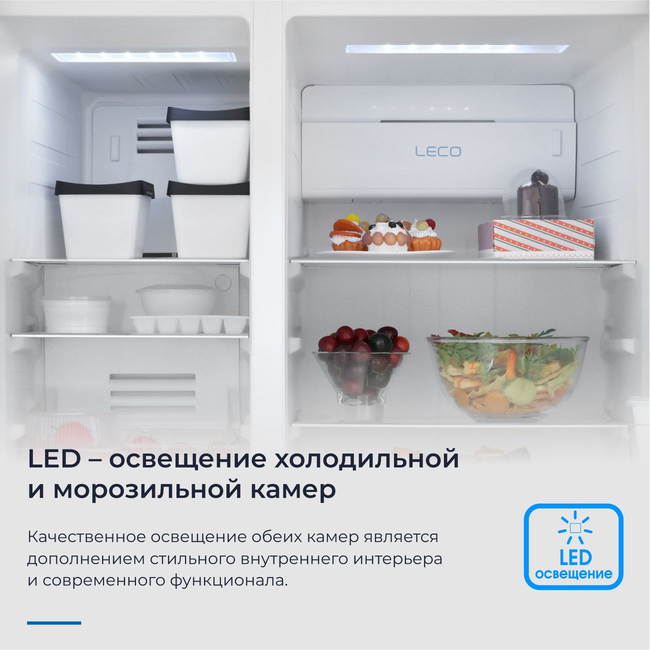Модель с двумя камерами объемом 365 л и 227 л позволяет разместить большое количество продуктов. Продуманную организацию хранения гарантируют по пять основных и по четыре боковых полки в каждом отсеке и по два ящика. Съемные элементы изготовлены из стекла и пластика. В комплектацию входят формочки для льда и подставка для яиц. Оба отделения оснащены LED-подсветкой.
