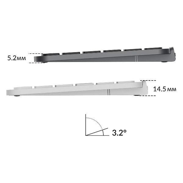 Белая светодиодная подсветка с несколькими уровнями яркости и различными эффектами обеспечивает комфортную работу при любом освещении. Встроенный аккумулятор емкостью 2200 мА*ч обеспечивает до 100 часов автономной работы при выключенной подсветке.