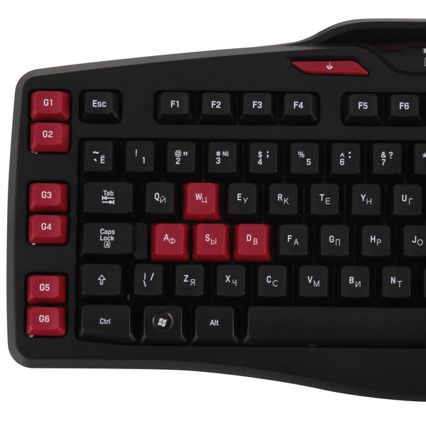Все игровые клавиши окрашены в красный цвет. Благодаря этому пользователь может найти их без промедления даже при слабой освещённости.