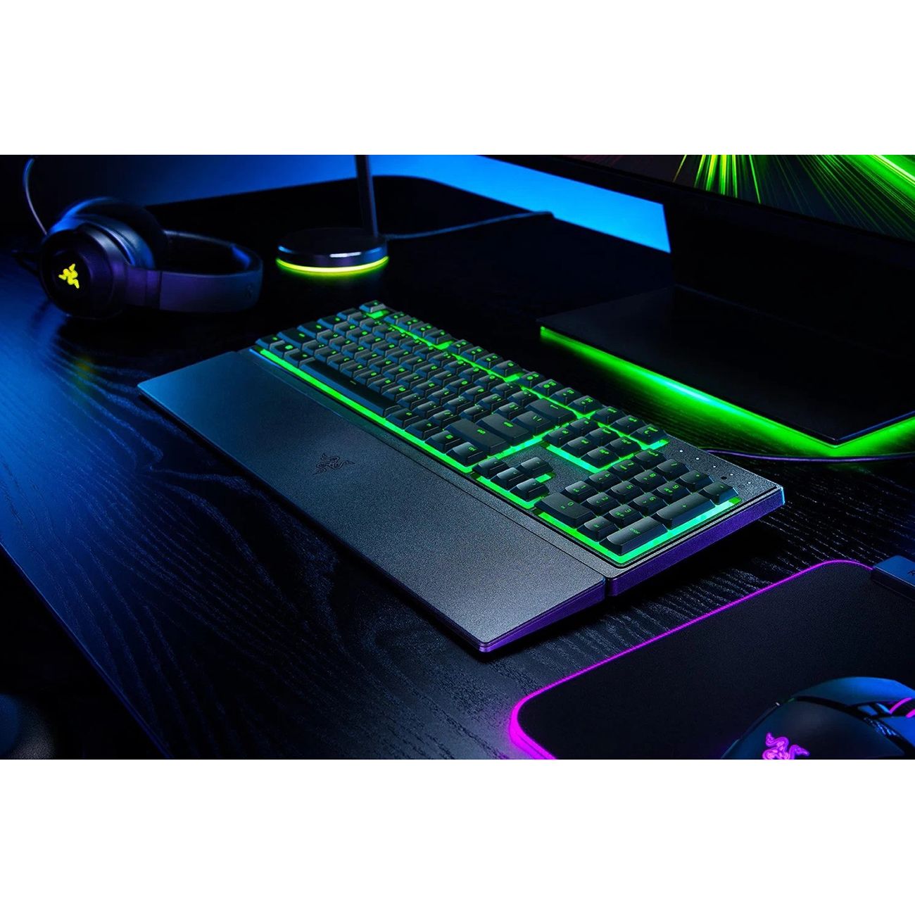 Игровая клавиатура Razer Ornata V3 X (RZ03-04470800-R3R1) выполнена в черном цвете. Русская и английская раскладка отличаются белым нанесением символов. Настраиваемая RGB-подсветка с 16,8 млн оттенков делает эксплуатацию комфортной. Устройство оснащено 104 программируемыми кнопками с мембранными переключателями. Удобство пользования прибором достигается благодаря наличию клавиши Windows, записи макросов на «лету» и подавлению фантомных нажатий.