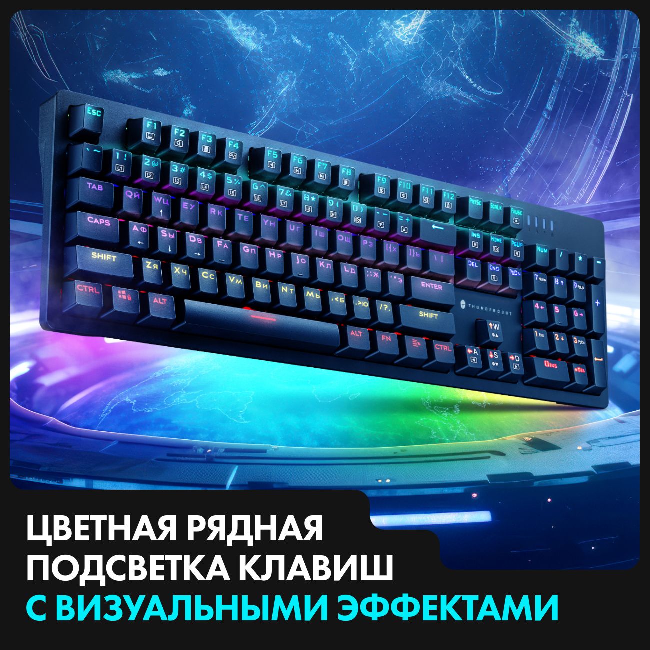 Игровая клавиатура Thunderobot KG3104R подсоединяется к персональному компьютеру через сетевой кабель длиной 1,5 м (включен в комплект) и интерфейс USB. Пластиковый черный корпус вмещает 104 механические клавиши с подсветкой RGB (в том числе кнопка Windows). Программное обеспечение находится на сайте производителя. Габариты — 3,4х44,5х13,4 см. Гарантия использования — 1 год. Общая масса — 810 г.