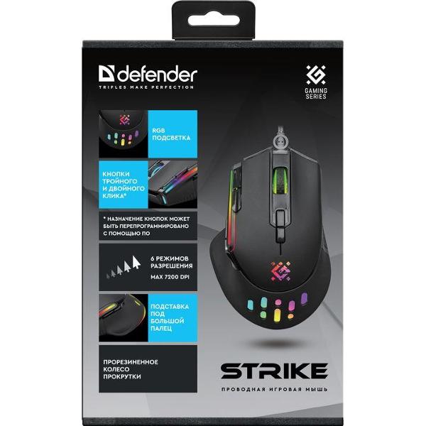 Игровая мышь Defender Strike GM-570 обладает редактором макросов, который позволяет создать уникальные комбинации кнопок, адаптированные под индивидуальный стиль игры. Чувствительность можно настроить в диапазоне от 800 до 2400 т/д. Максимальное допустимое ускорение составляет 20 g, скорость перемещения — 152 см/сек.