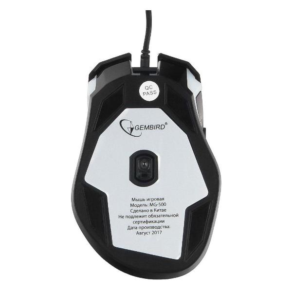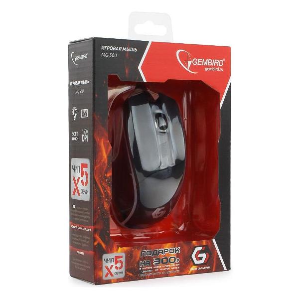 Игровая мышь Gembird MG-500 подключается к компьютеру проводным способом через USB-порт. Для начала использования устройства не требуется устанавливать дополнительное ПО. В конструкции использован сенсор высокой точности с разрешением 1000-1600 dpi. На корпусе находятся пять кнопок с возможностью программирования, настраиваемых под конкретную игру. Внешний вид мыши подчеркивает светодиодная подсветка. Материал исполнения корпуса — высококачественный пластик с приятным на ощупь покрытием.