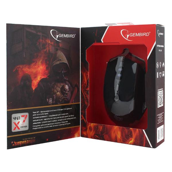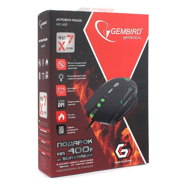 Игровая мышь Gembird MG-600 с дизайном под правую руку — модель в корпусе черного цвета, снабженная прорезиненным колесом и шестью кнопками. Предусмотрена RGB-подсветка с четырьмя оттенками. Оптическое разрешение можно настраивать от 1000 dpi до 3200 dpi, что делает мышь идеальной для соревновательных онлайн-игр.