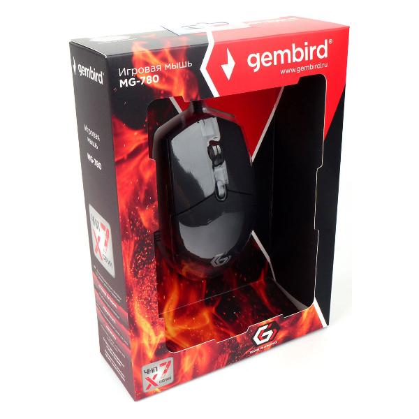 Игровая мышь Gembird MG-780 — устройство в черном корпусе с небольшим логотипом и яркой разноцветной подсветкой Running horse. Модель обладает пятью кнопками, в том числе боковыми и специальной клавишей для смены режима датчика. Колесико прокручивается тихо. Благодаря эргономичной форме мышь не утомляет руку.