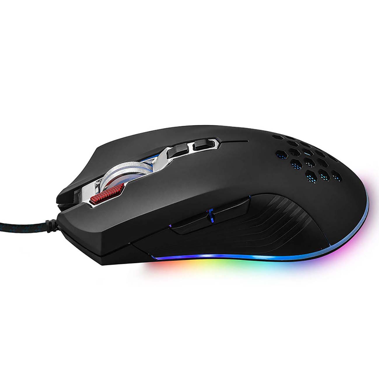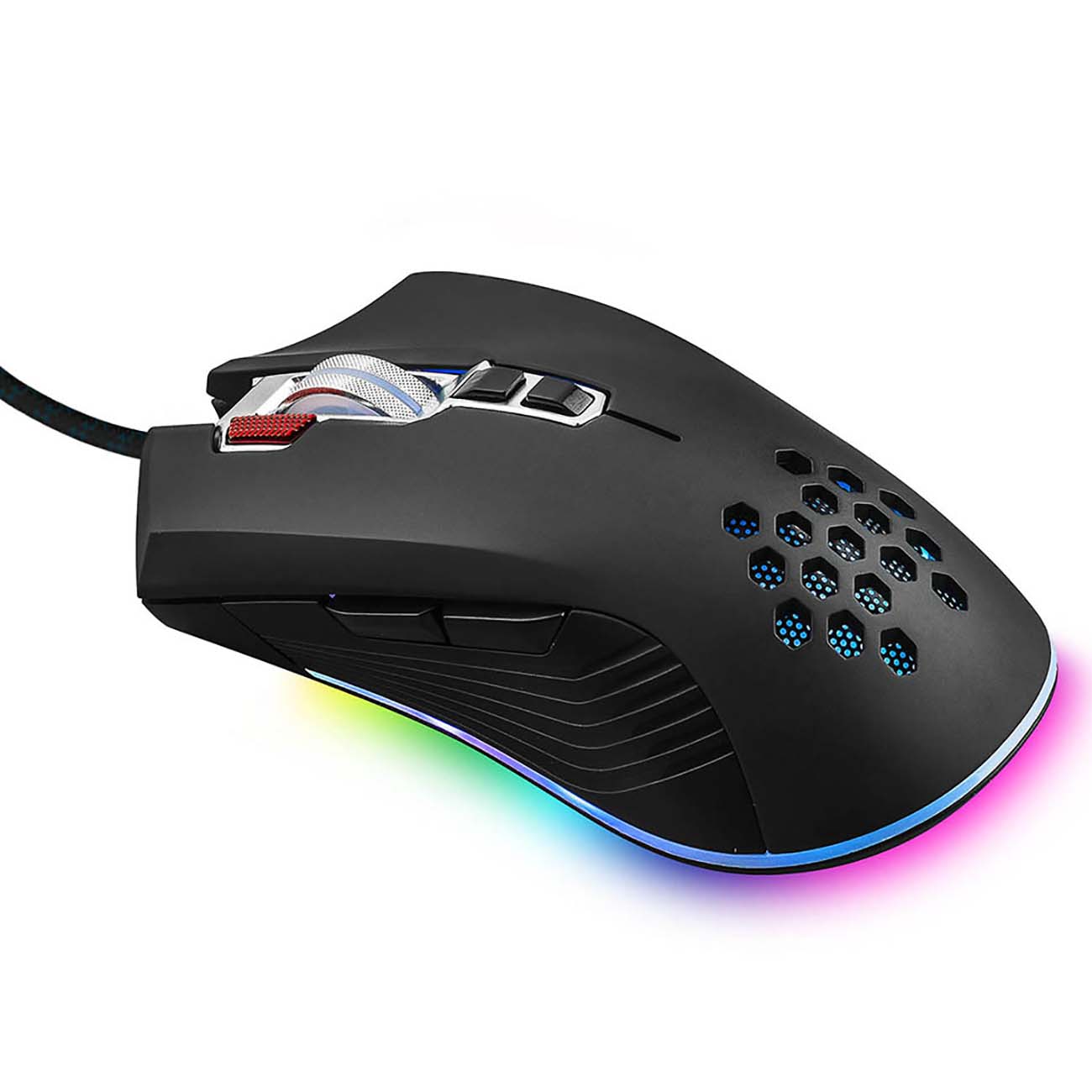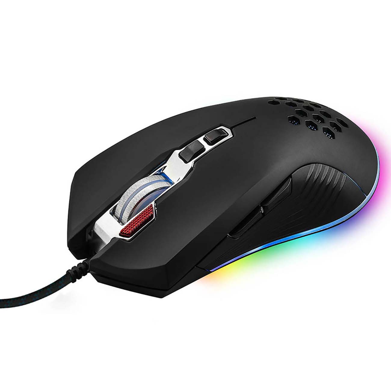 Плавные обводы корпуса и симметричная форма позволяет спокойно удерживать аксессуар в руке, не испытывая неудобств. Создатели оборудовали своё детище достаточно чувствительным металлическим колесом прокрутки и дополнительными клавишами, расположенными на левом боку. А для подключения используется длинный USB-кабель в нейлоновой оплётке.