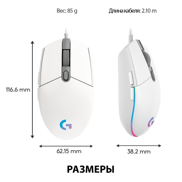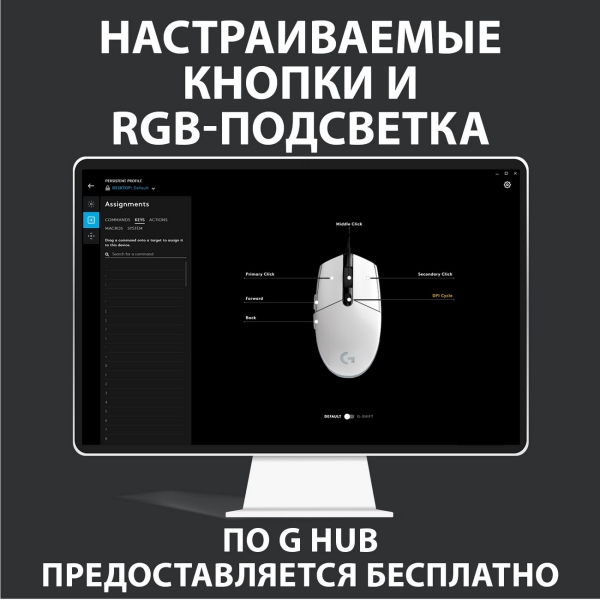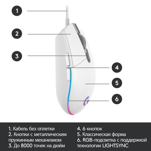 Игровая мышь Logitech G102 LightSync White выполнена в корпусе эргономичной формы, за счет чего удобно лежит в правой руке. Разрешение сенсора 8000 dpi обеспечивает быстрое перемещение курсора. У модели шесть кнопок, каждую из которых можно запрограммировать для совершения определенных действий в игре.
