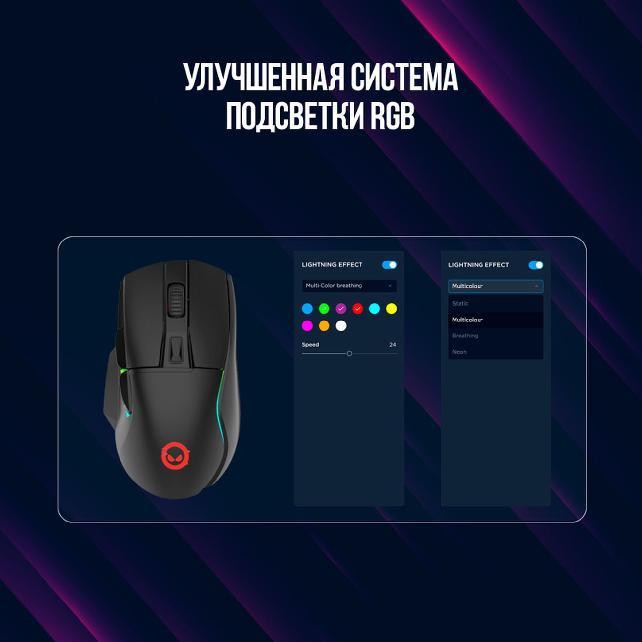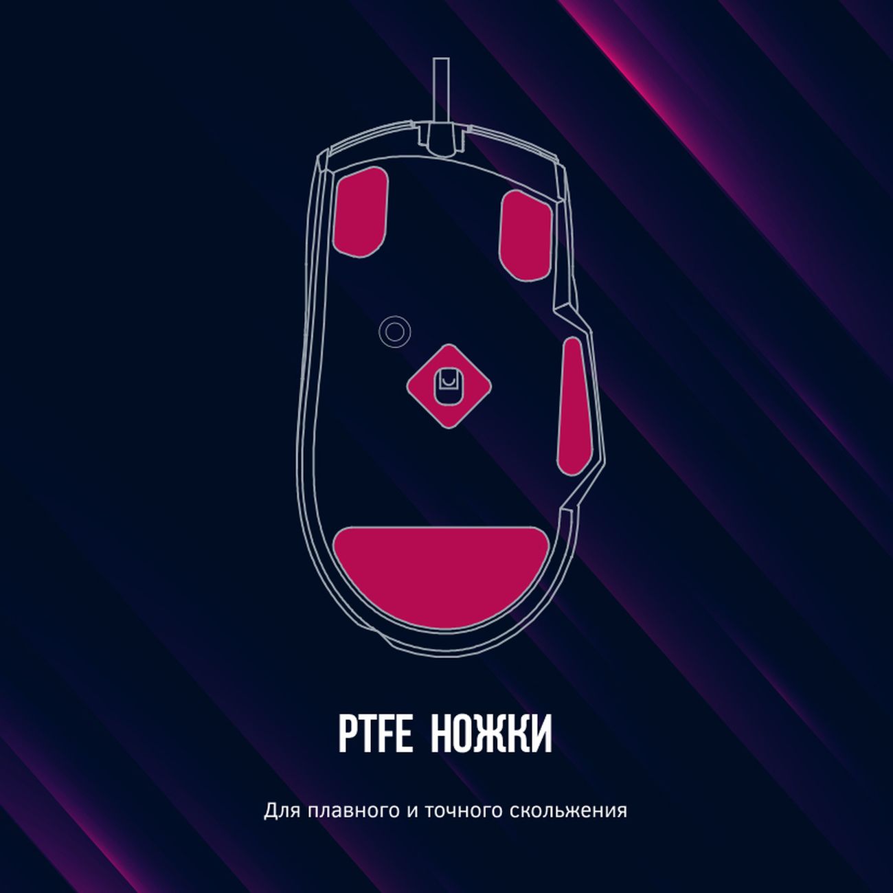 Эта модель оснащена шестью кнопками управления и скроллером. Разрешение настраивается вплоть до 8000 т/д. Прорезиненное покрытие обеспечивает комфортное расположение ладони. Манипулятор оборудован RGB-подсветкой с четырьмя уровнями пульсации. С компьютером устройство синхронизируется через порт USB. Вес мыши — 115 г.