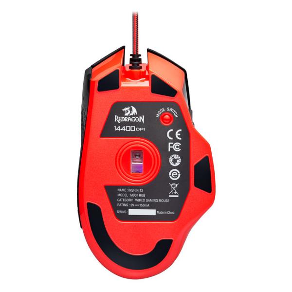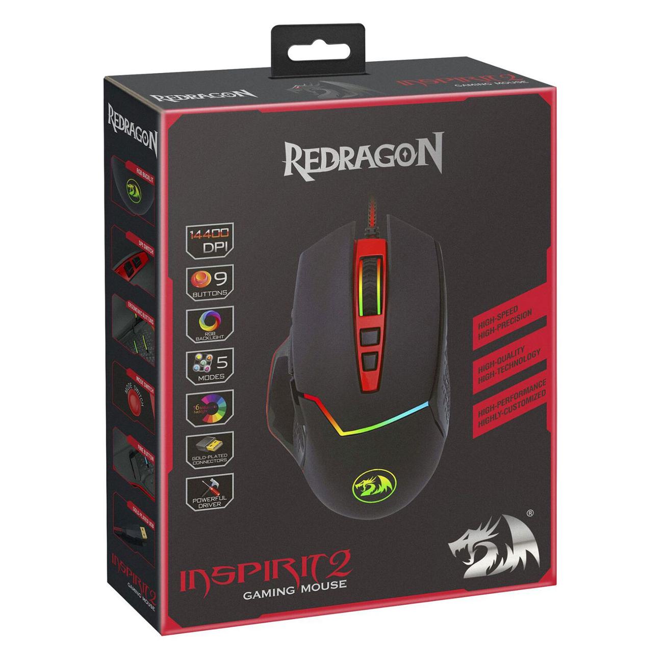 Игровая мышь Redragon Inspirit 2 — контроллер с оптическим сенсором PixArt P3327, скорость которого можно изменить до 12400 dpi при ускорении 20 g. Корпус устройства выполнен из черного пластика, снабжен RGB-подсветкой и логотипом компании. Для удобного хвата предусмотрен боковой упор под большой палец.