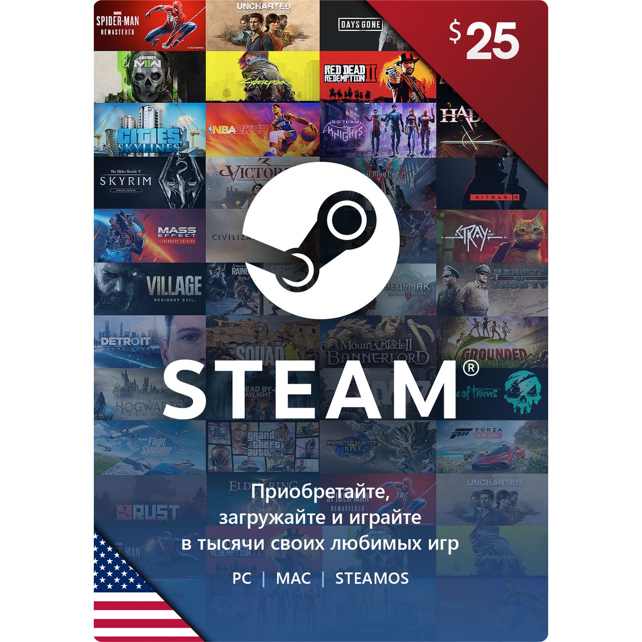Вы можете купить Игровая валюта PC Steam Wallet Карта оплаты Steam 25 USD USA в магазинах М.Видео по доступной цене. Игровая валюта PC Steam Wallet Карта оплаты Steam 25 USD USA: подробное описание, фото и отзывы реальных покупателей, характеристики, возможность скачать инструкции и подобрать аксессуары.
