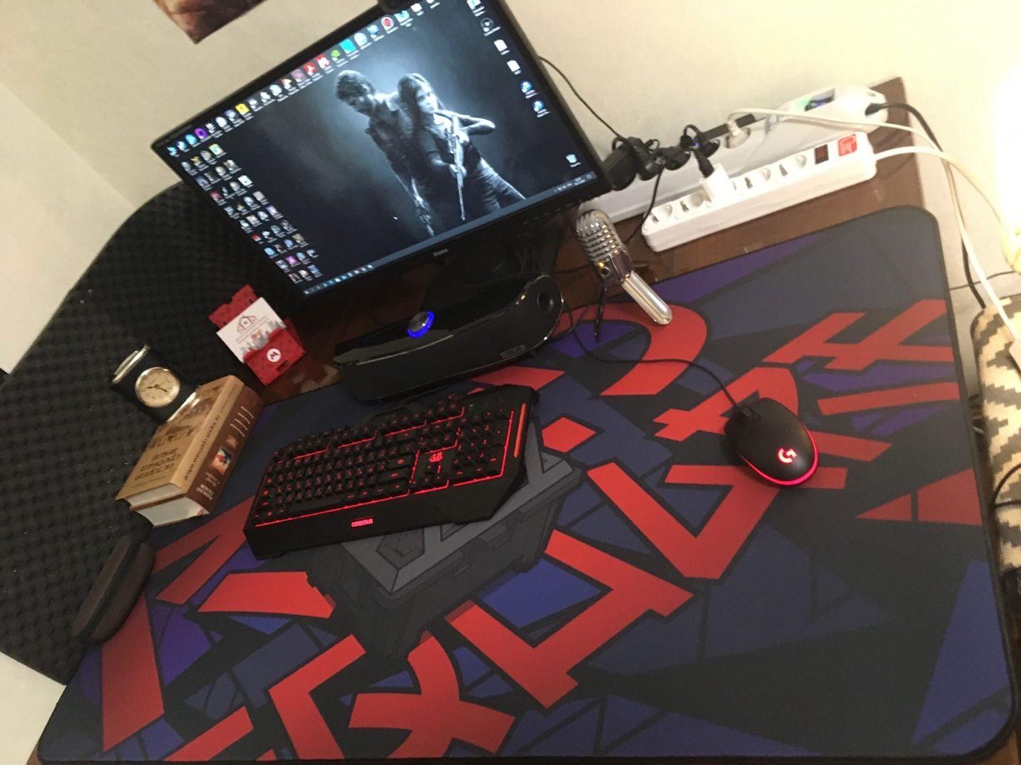 Коврик, из плотного материала, удобный, мышь по нему хорошо, приятно ходит, а клавиатура на нем очень хорошо стоит. Размер 1200*600