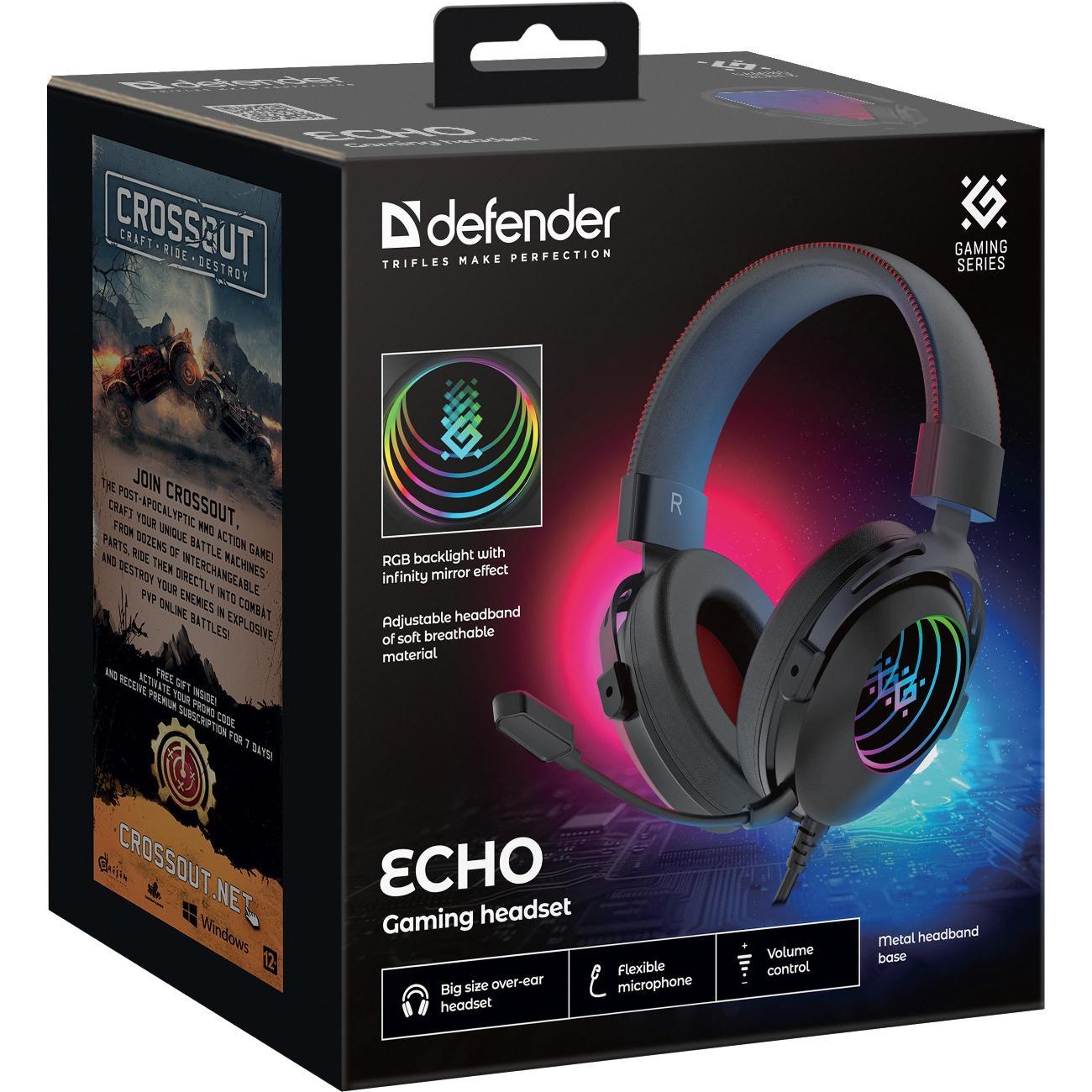 Игровые наушники Defender Echo оснащены накладной конструкцией с амбушюрами из экокожи и регулируемым оголовьем.