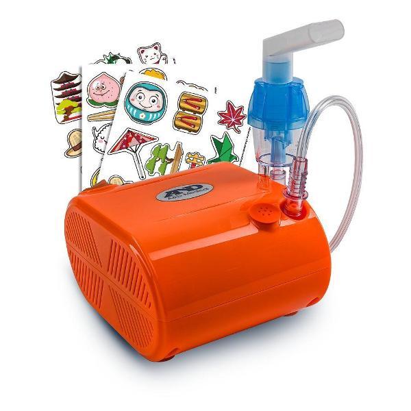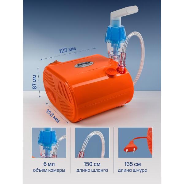 Ингалятор управляется с помощью одного переключателя, при включении загорается индикатор. Устройство подключается к сети 220 В с помощью сетевого шнура длиной 1,5 м, получая энергию через блок питания. Уровень шума прибора не превышает 60 дБ. Особенность модели — наличие наклеек в комплекте, которыми ребенок сможет украсить аппарат. Лекарство заливается в резервуар объемом 6 мл. При перегреве компрессор автоматически выключится за счет встроенной защиты.