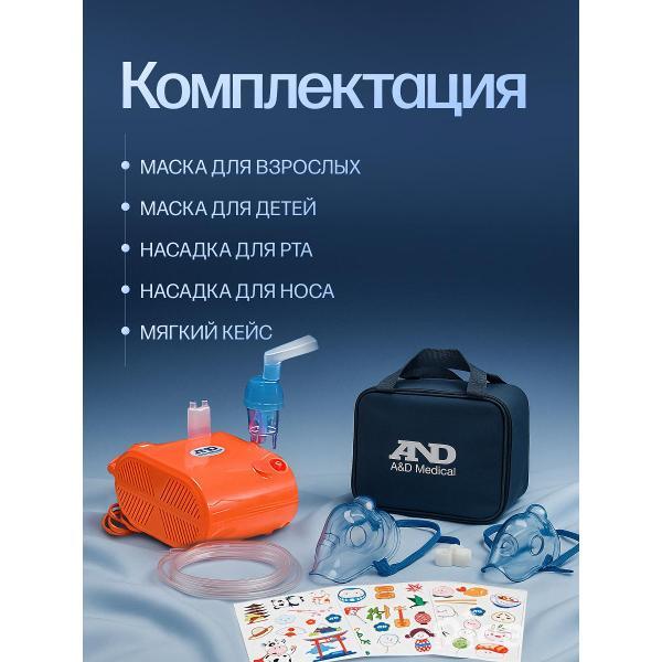 Ингалятор способен проработать в непрерывном режиме до 30 минут. Данный небулайзер не разрушает структуру лекарств, поэтому совместим с большим количеством препаратов, в том числе с гормонами и антибиотиками. Прорезиненные ножки не позволяют аппарату скользить по рабочей поверхности. Корпус выполнен из прочного износостойкого пластика. В комплекте с моделью две насадки для носа и рта, две маски — взрослая и детская, воздуховодная трубка, небулайзерная камера, пять сменных воздушных фильтров и удобный кейс для хранения.