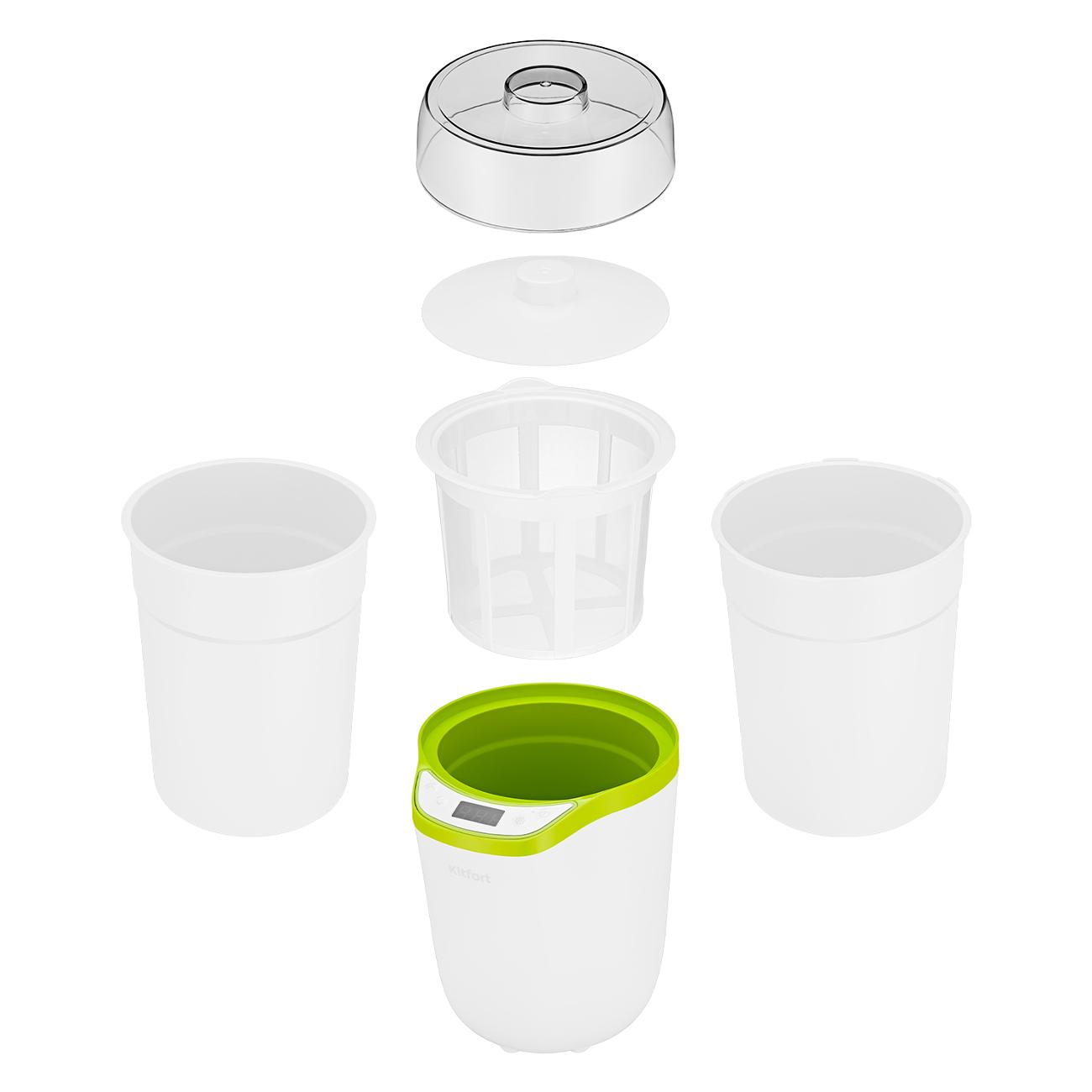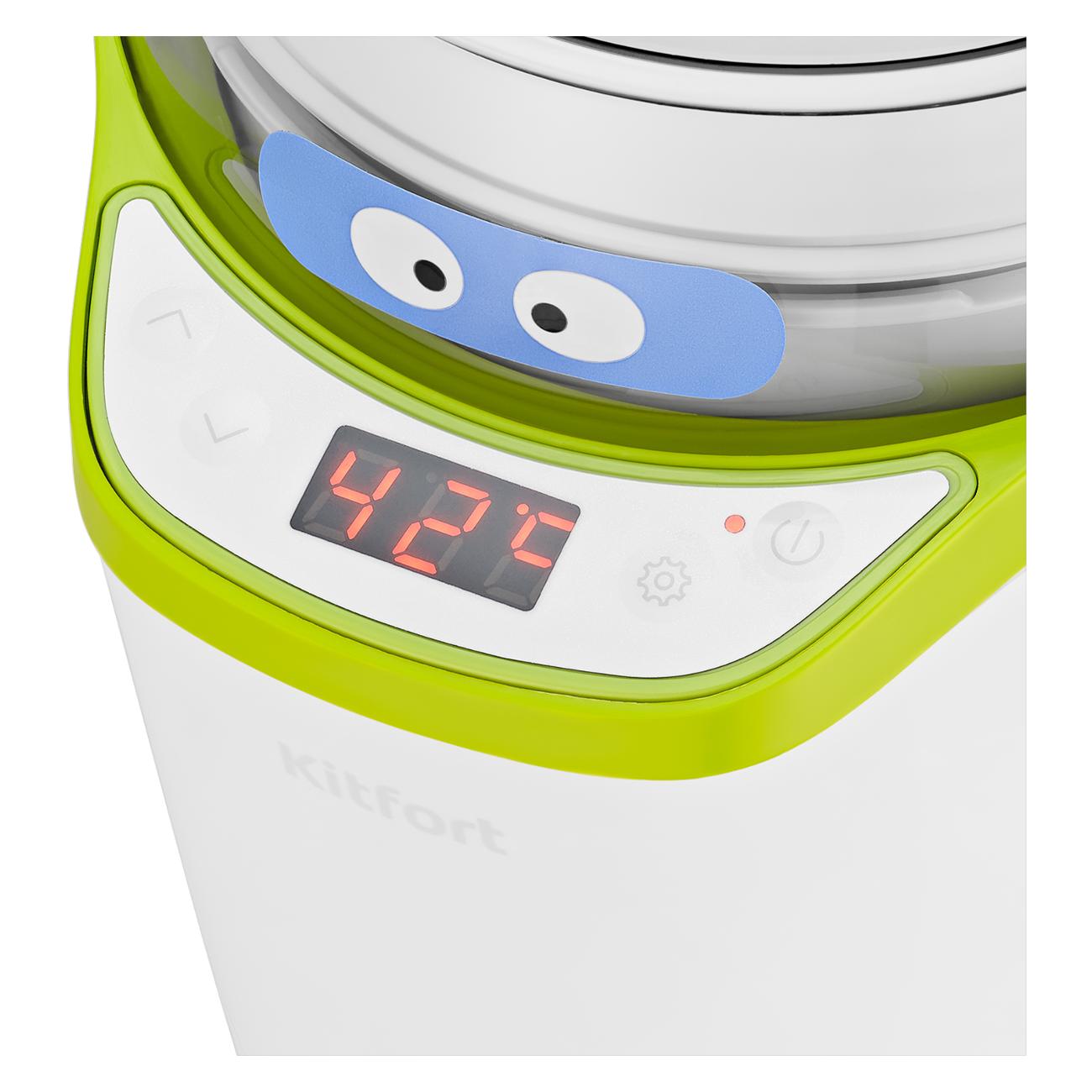 Йогуртница Kitfort КТ-2077-2 мощностью 25 Вт выполнена в пластиковом корпусе белого и салатового цвета и поставляется в комплекте с двумя контейнерами объемом 1,6 л и 1,8 л. На верхней части корпуса есть кнопки управления и дисплей, отображающий температуру приготовления — дополнительно можно отрегулировать время с шагом 1 час и температуру от 25°С до 65°С с шагов в 1°С. Для подключения к сети питания используется кабель длиной 1,1 м. Размер модели — 155х180х240 мм при весе 0,9 кг.