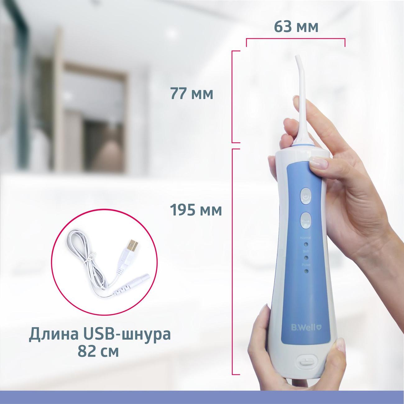 Водоустойчивый корпус позволяет промывать ирригатор под проточной водой. Прорезиненная ручка обеспечивает надежный хват и не выскальзывает из ладони. Источником питания выступает встроенная аккумуляторная батарея. Полного заряда хватает на 70 минут. Восполнение энергозатрат осуществляется через USB-порт. Размеры модели — 7,5х21х8,5 см, вес — 0,389 кг.