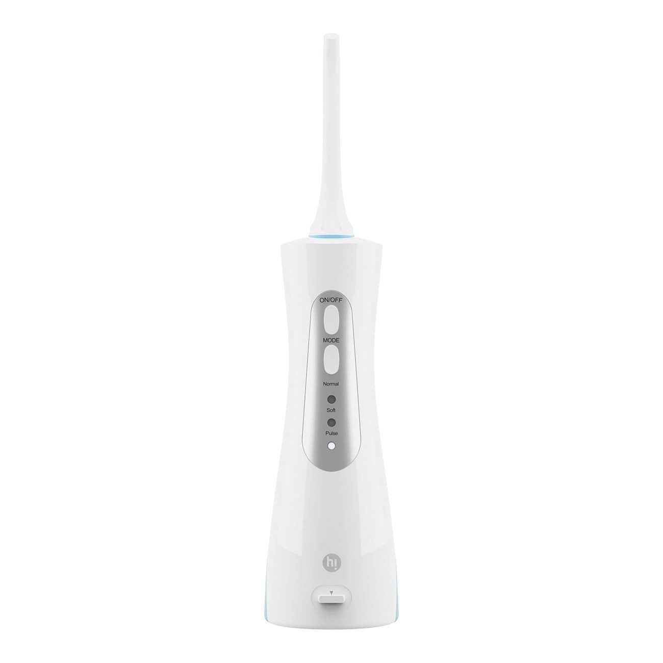Ирригатор Hi WF-003 бело-голубого цвета с тремя режимами работы оснащен функцией регуляции потока. Корпус влагозащитный. В комплекте идут два флосс-картриджа. Распыление осуществляется с помощью пульсации.