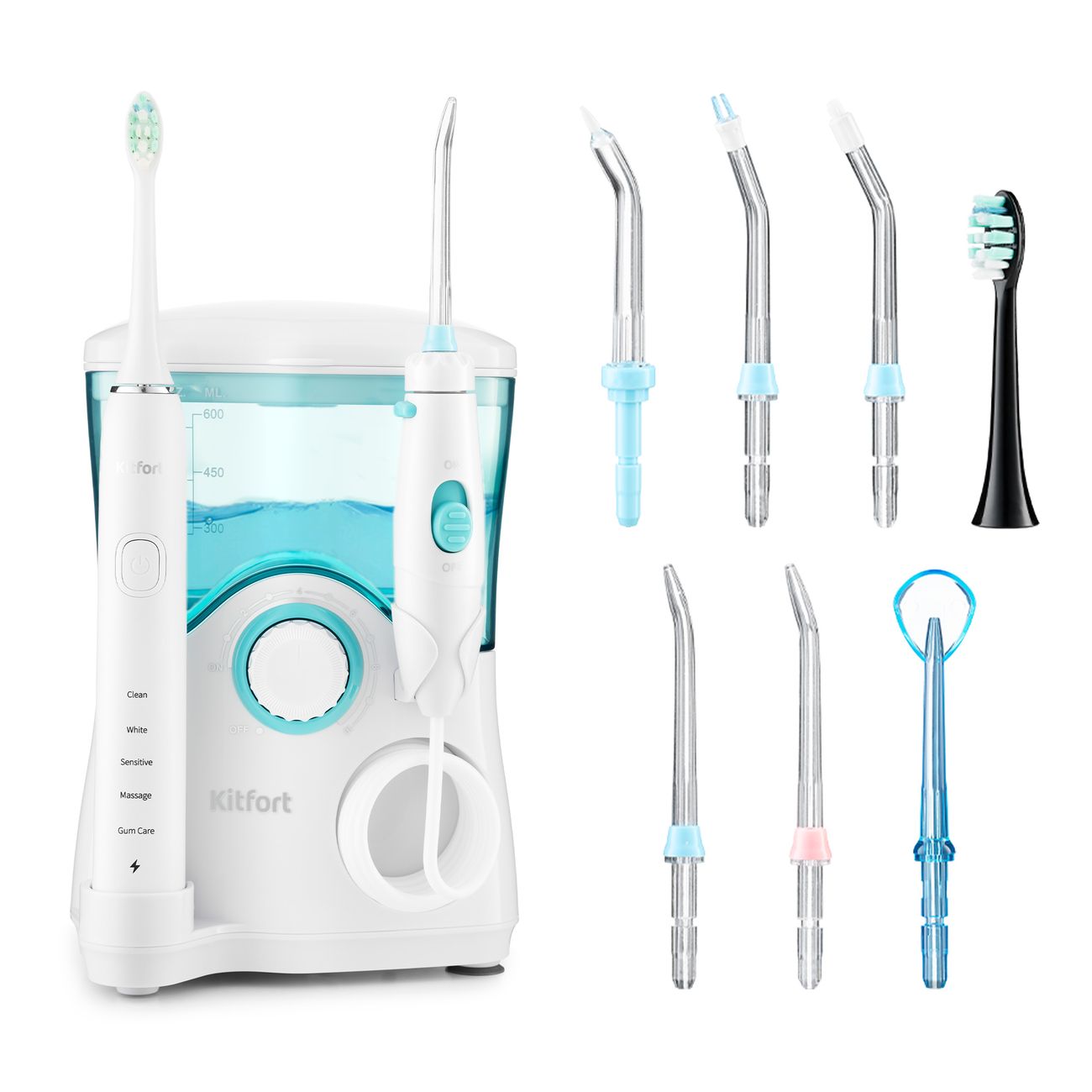 и 7 насадки для ирригатора( в инструкции указано, для чистки языка, брекетов, зубов с налетом и др.)