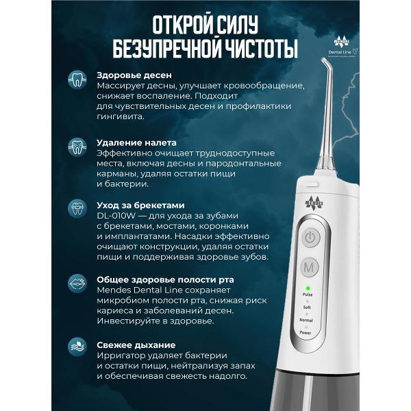 Вы можете купить Ирригатор Mendes DL010WH в магазинах М.Видео по доступной цене. Ирригатор Mendes DL010WH: подробное описание, фото и отзывы реальных покупателей, характеристики, возможность скачать инструкции и подобрать аксессуары.
