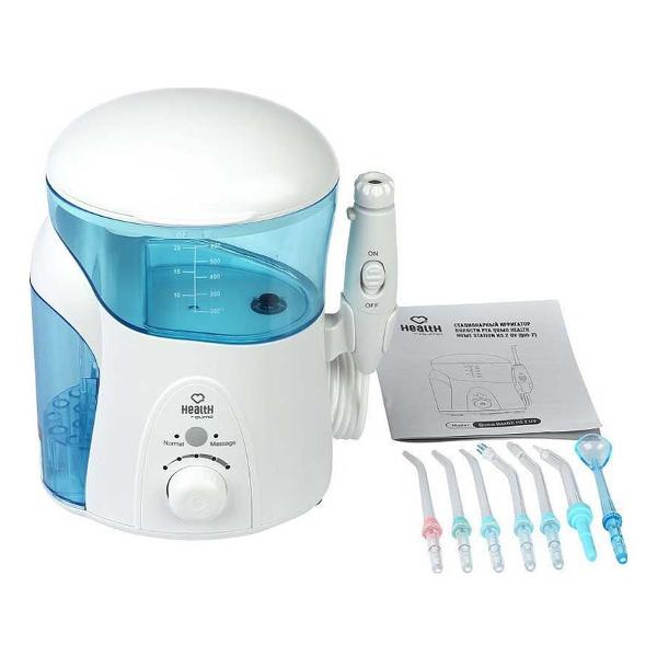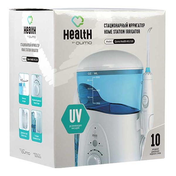 Ирригатор Qumo Health Home Station HS 2 UV, белый/голубой обладает габаритными размерами 20,8х14х10,5 см. Вес устройства составляет 904 г. В комплекте поставляются семь насадок. Предусмотрен адаптер давления на десять уровней. Реализована возможность дезинфекции системой UV-диапазона.