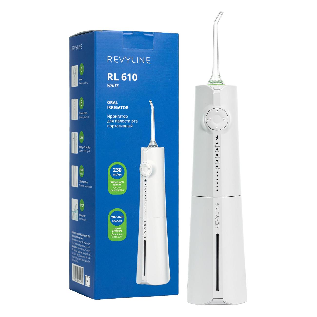 Портативный ирригатор полости рта Revyline RL610, белый оснащен регулятором потока на шести уровнях. Минимальное давление воды составляет 207 кПа, максимальное— 828 кПа. У модели пять режимов работы.