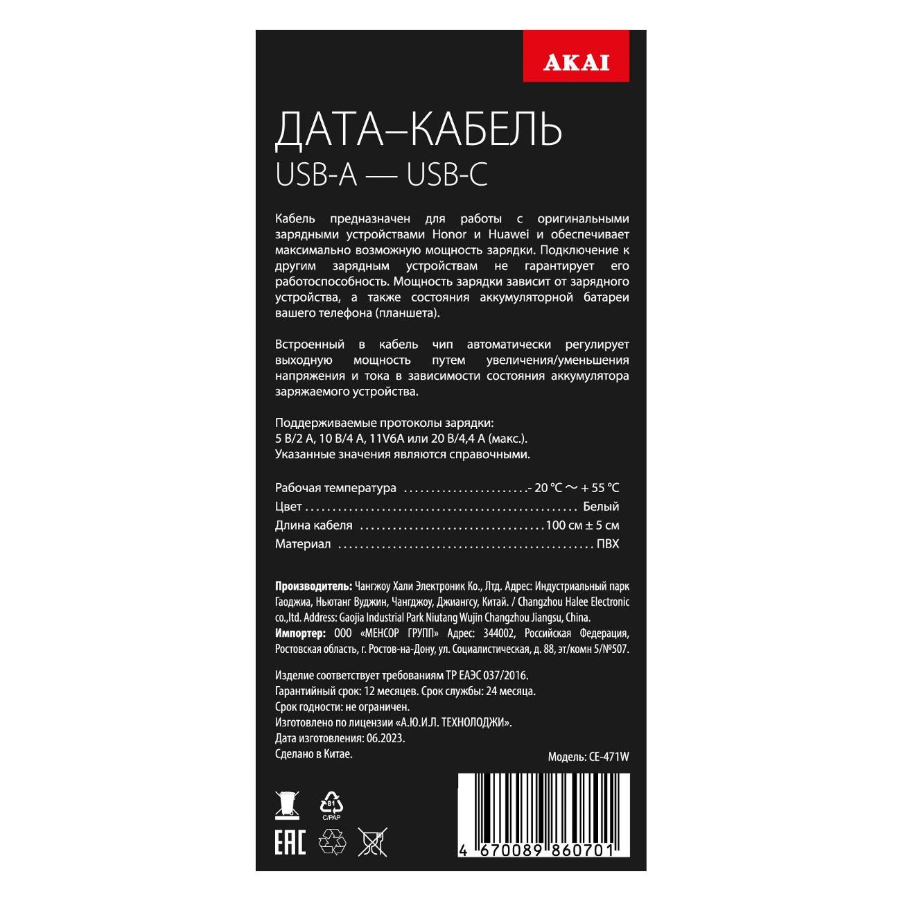 Вы можете купить Кабель USB Type-C Akai USB-A-Type C 1м (CE-471W) в магазинах М.Видео по доступной цене. Кабель USB Type-C Akai USB-A-Type C 1м (CE-471W): подробное описание, фото и отзывы реальных покупателей, характеристики, возможность скачать инструкции и подобрать аксессуары.