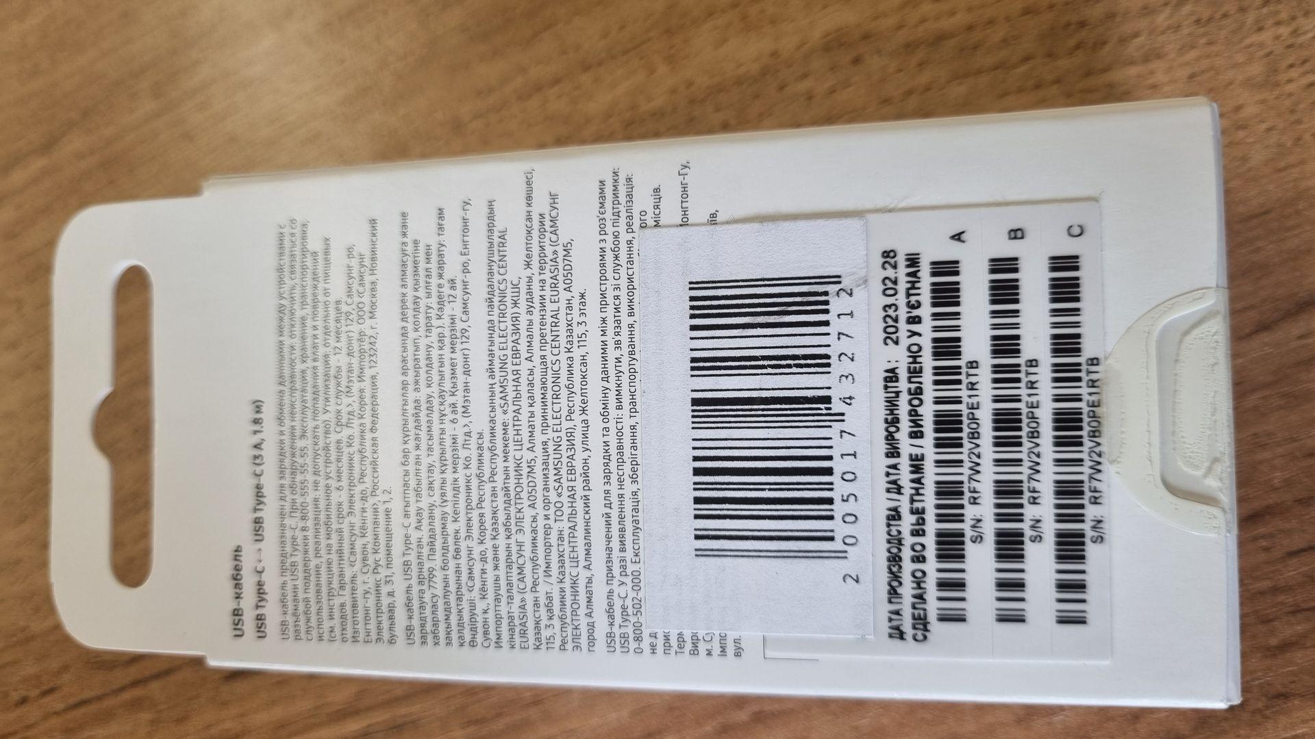 Оригинальный кабель от Samsung с длиной провода 1,8 м, как раз искали длинный провод для зарядки, разъём type-c на type-c, поддерживает быструю зарядку, если использовать оригинальный блок от Samsung с 3А. Используем с оригинальным блоком от Samsung EP-TA800 25 Вт 3 А. Поддержка быстрой зарядки есть. Сделано в Вьетнаме.