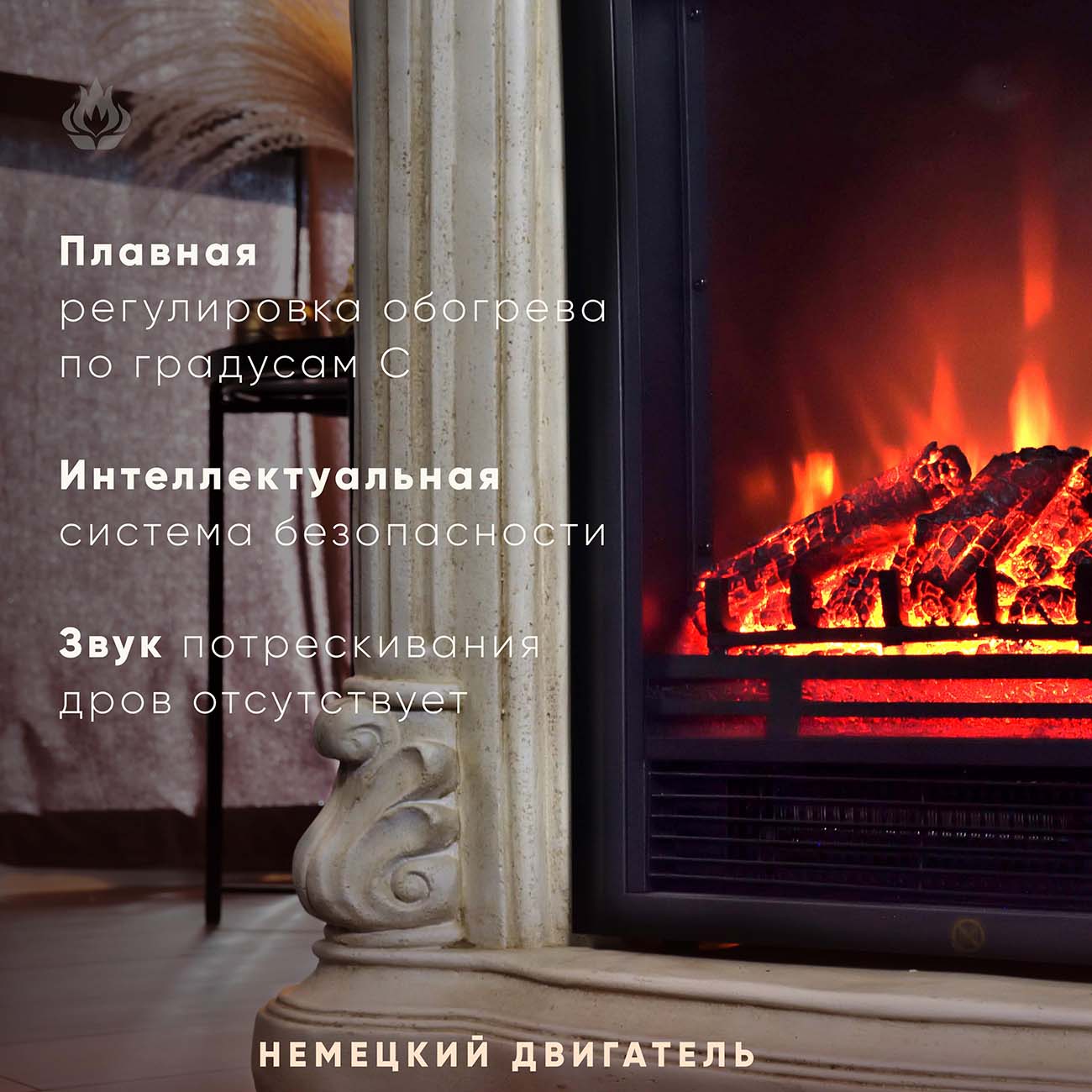 Электрический камин Element Flame «Алессандра» с реалистичной имитацией тлеющих поленьев оснащен подсветкой с лампой накаливания. Доступна регулировка яркости пламени и громкости звукового сопровождения.