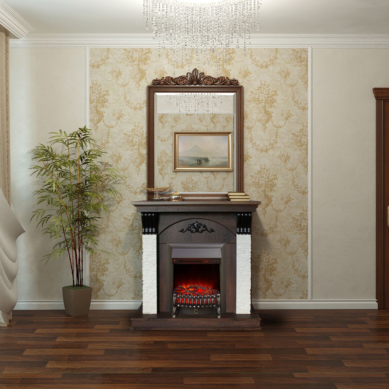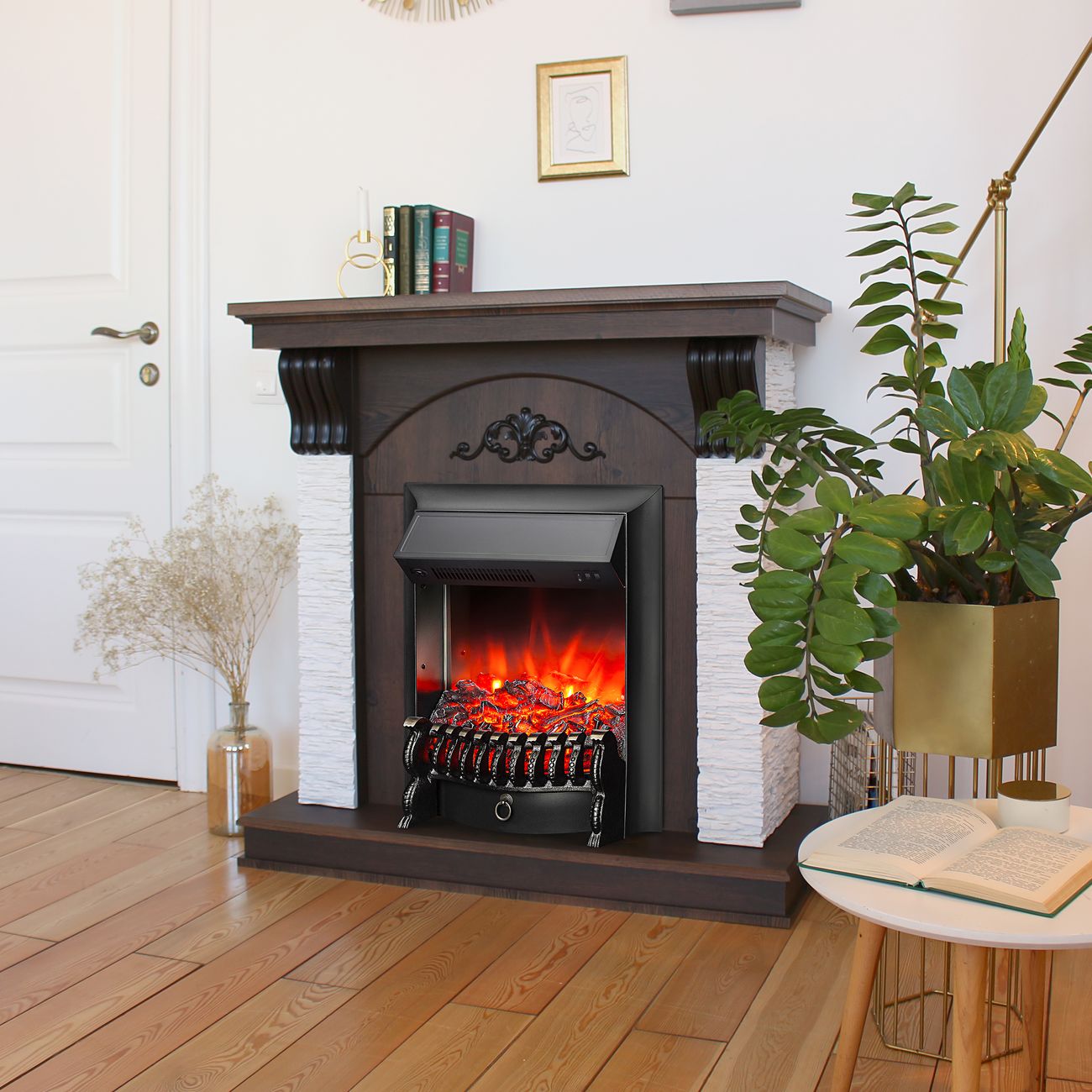 Доступна работа в режиме визуализации пламени без обогрева. Для проекции огня используются лампы накаливания с возможностью регулировки уровня яркости. Камин предназначен для напольного монтажа у стены. Встроены звуковые эффекты потрескивания горящих дров. Размер устройства составляет 103,5x109x41 см. Модель оснащена защитой от перегрева.