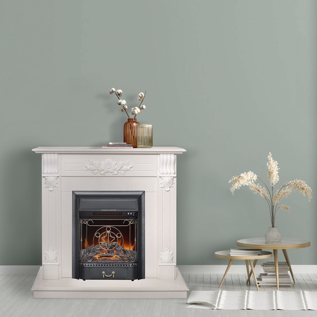 Электрический камин RealFlame Ottawa STD/EUG WT+Majestic-S BL оборудован звуковыми и световыми эффектами, имитирующими горение дров. Внутри очага размещен муляж тлеющих поленьев. Встроен нагревательный элемент в виде конвектора принудительного типа с поддувом. Мощность обогрева можно установить на 750 или на 1500 Вт. Управление устройством осуществляется при помощи кнопок, расположенных на фронтальной панели.