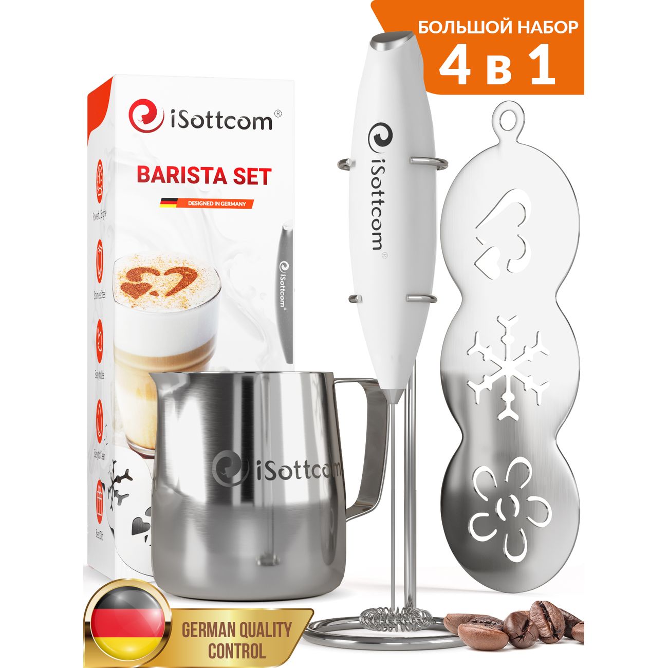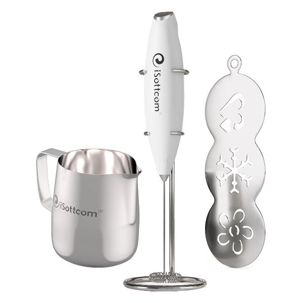 Корпус iSottcom Barista выполнен из ударопрочного пластика, прибор укомплектован металлической чашей и трафаретом для создания рисунков на пенке. Размеры прибора — 23х3х3 см, вес — 430 г.