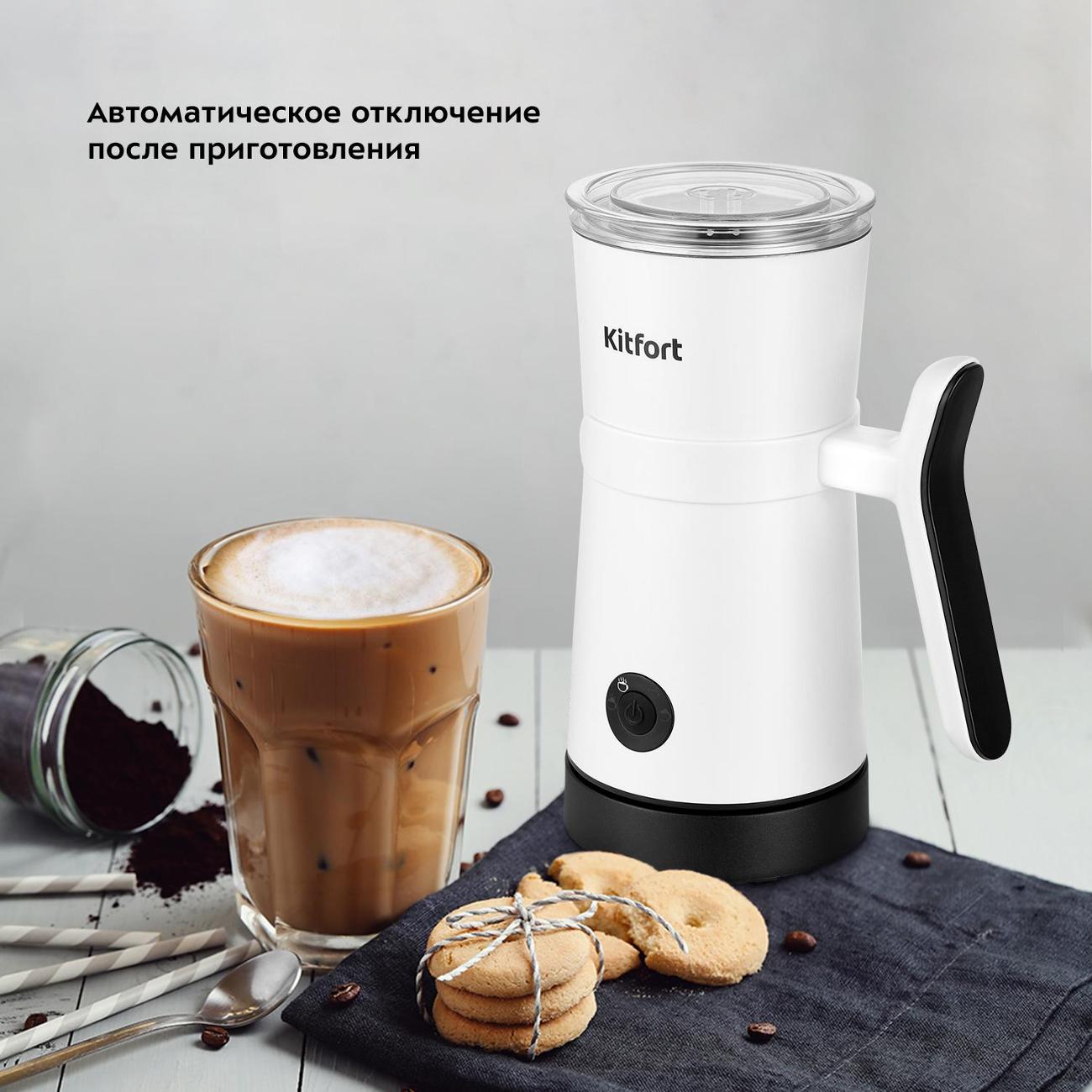 Капучинатор Kitfort КТ-7176 в белом металлическом корпусе вмещает 0,45 л. Модель весит 0,71 кг и питается от сети, потребляя 400 Вт мощности. Прибор получил антипригарное покрытие, прозрачную крышку и отсек для 0,7-метрового сетевого кабеля. Устройство поддерживает четыре режима работы и автоматическое выключение. Управление представлено кнопочной панелью со встроенной подсветкой и индикацией. В комплект вошла одна насадка для смешивания и две для вспенивания.