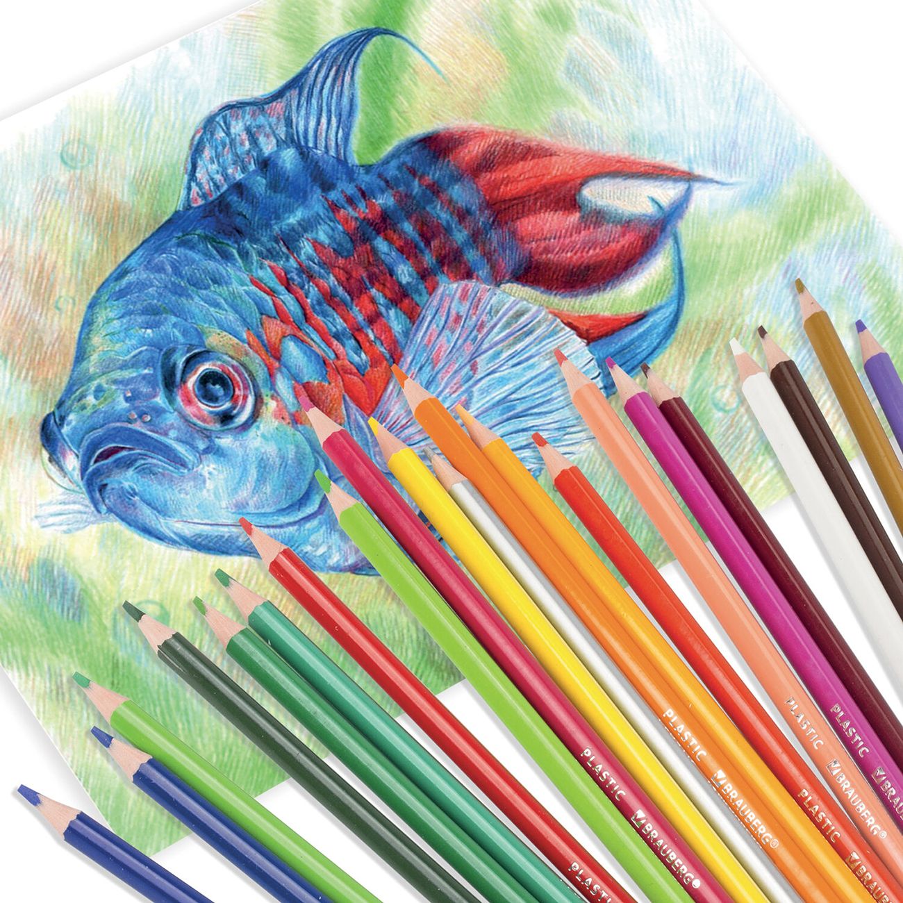 Набор состоит из 24 цветов: черный, темно-синий, синий, голубой, салатовый, зеленый, темно-зеленый, болотный, серо-зеленый, желтый, оранжевый, темно-оранжевый, персиковый, фуксия, розовый, красный, темно-красный, бордовый, песочный, серый, светло-серый, фиолетовый, темно-коричневый, коричневый. Трехгранная форма сечения корпуса позволяет не скатываться карандашу с поверхности стола во время занятий рисованием. Карандаши изготовлены из переработанного пластика и имеют лакированный корпус. Качество исполнения гарантирует легкую заточку. Грифель диаметром 3 мм обладает повышенной прочностью. Все карандаши заточены и поставляются в картонной упаковке с европодвесом.