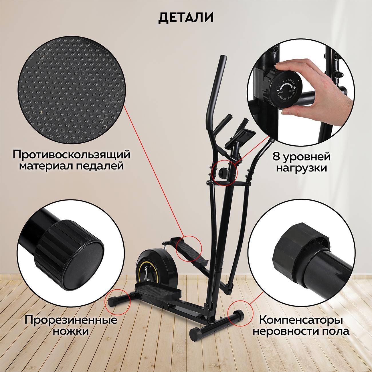 Вес маховика составляет 3 кг. Противоскользящие педали, прорезиненные ножки корпуса эллипса обеспечивают безопасность при использовании тренажера. Для компенсации неровности пола предусмотрены специальные накладки.