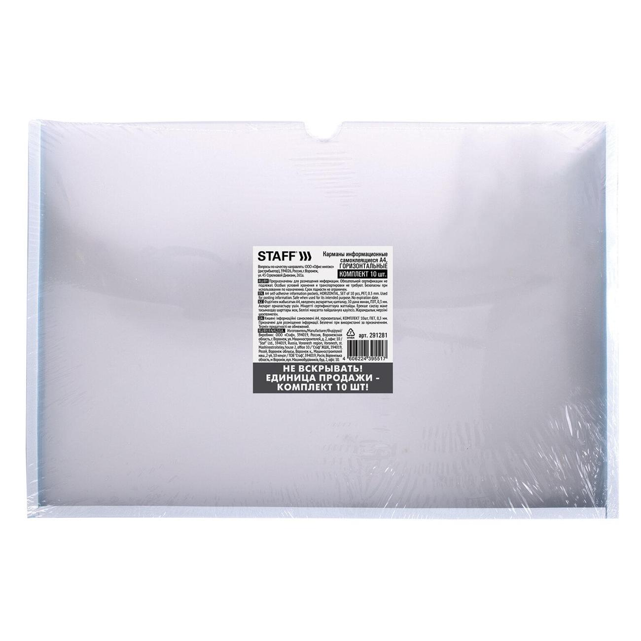 Надежно приклеиваются и держатся на любых гладких поверхностях при помощи скотча, расположенного по трем сторонам кармана. После снятия защитной ленты цвет кармана приобретает белый цвет, что идеально впишется в любой интерьер. Благодаря прозрачному покрытию документы отчётливо видны посетителю, не мнутся и не загрязняются в течение всего эксплуатационного периода. Материал изготовления: ПЭТ толщиной 0,3 мм. Единица товара: комплект из 10 шт., упакованный в термоусадочную пленку.