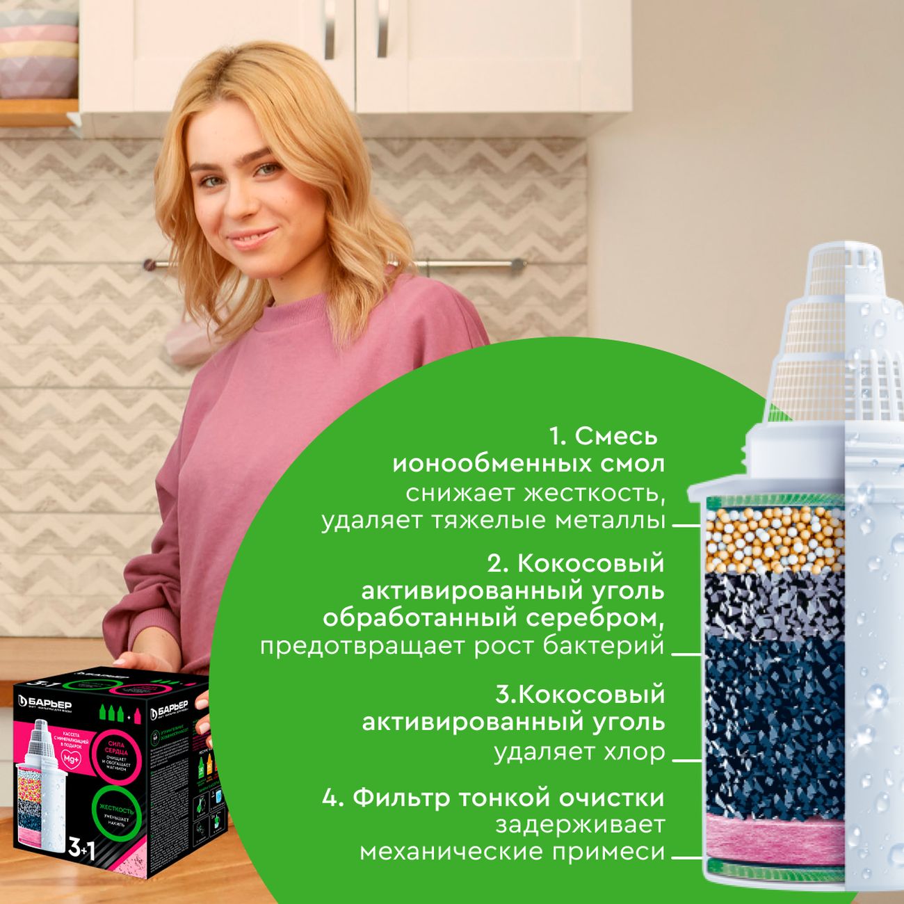 Картриджи «Барьер + Актив Сила Сердца» – обновлённая линейка, созданная для эффективного очищения воды от вредных примесей. Фильтр активно удаляет тяжёлые металлы, хлор и другие побочные продукты, обеспечивая умягчение воды и предотвращение образования накипи.