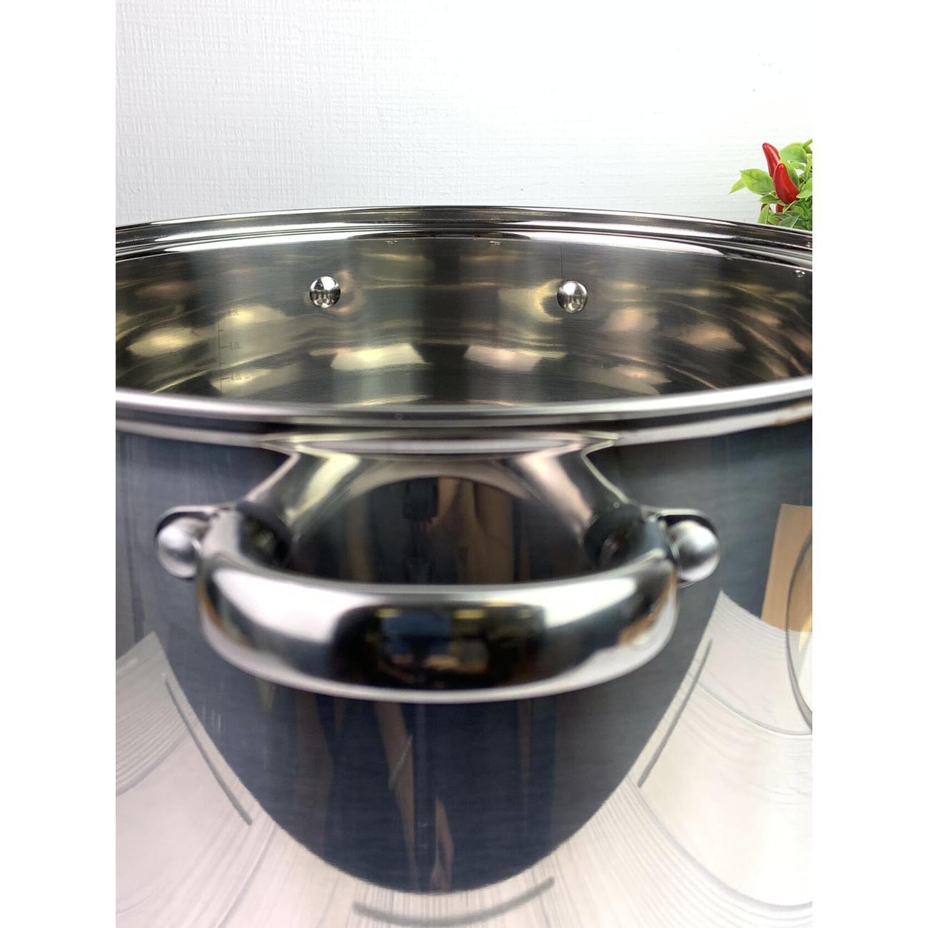 Преимущество данной посуды - это толстое дно 7 мм, клепанные ручки, крышка с металлическим ободком и пароотводом, мерная шкала ну и конечно же большой объем.