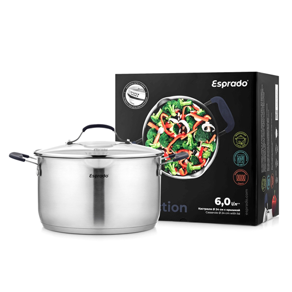 Кастрюля Esprado емкостью 6 л изготовлена из высококачественной нержавеющей стали, посуда из нее не ржавеет, не окисляется, не портится от моющих средств. Утолщенное дно позволяет пище равномерно нагреваться. Прочная крышка плотно прилегает к емкости, предотвращая выкипание жидкости. Кастрюля совместима со всеми типами плит, включая индукционные. Кастрюлю можно мыть в посудомоечной машине.