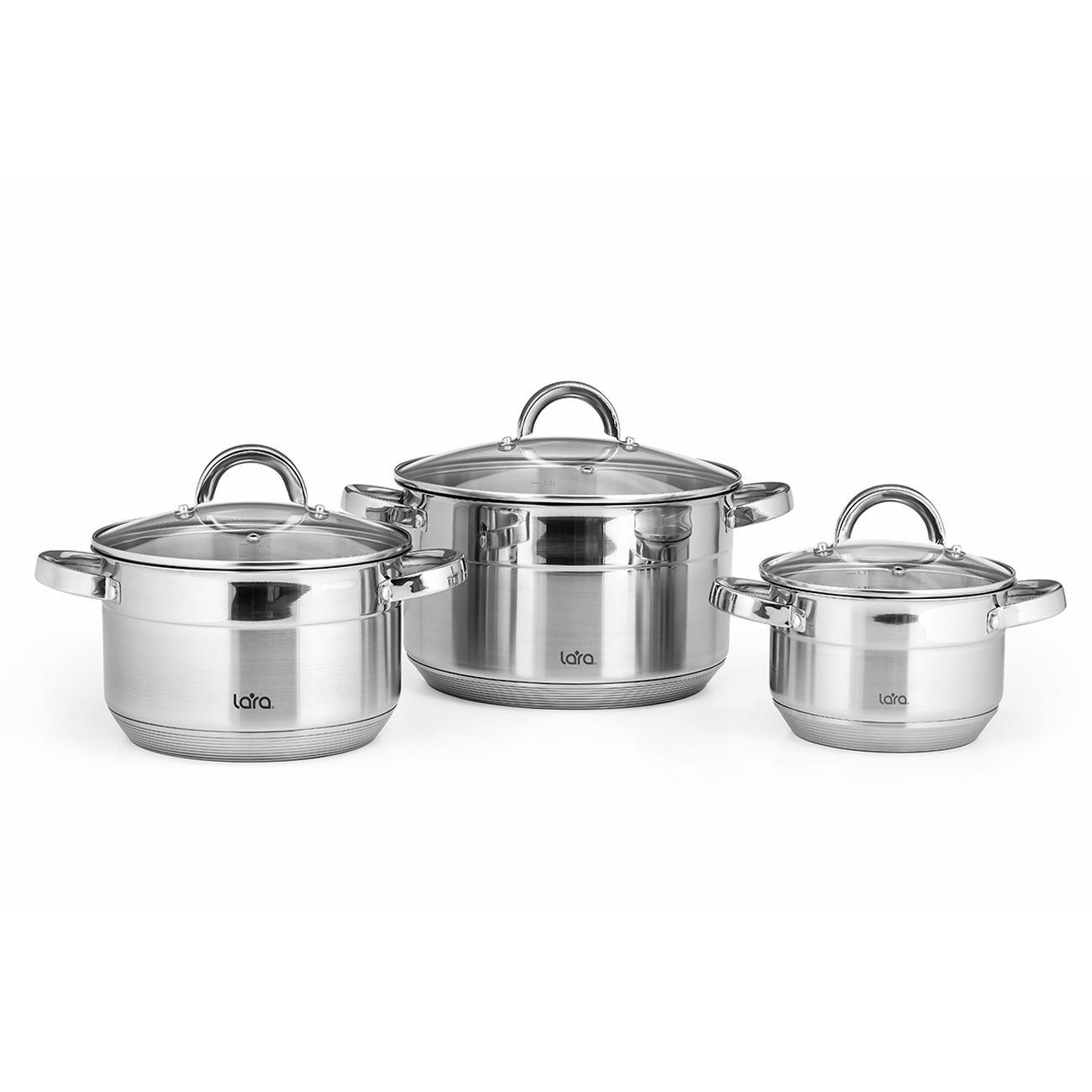 Набор посуды Lara Aurora включает две кастрюли объемом 2, 3,8 и 6,3 л. Они выполнены из нержавеющей стали ― износостойкого и прочного материала, не деформирующегося под регулярным воздействием высоких температур. Девятислойное капсульное дно позволяет использовать их на любых варочных поверхностях, в том числе и индукционных. Доступна очистка в посудомоечной машине.