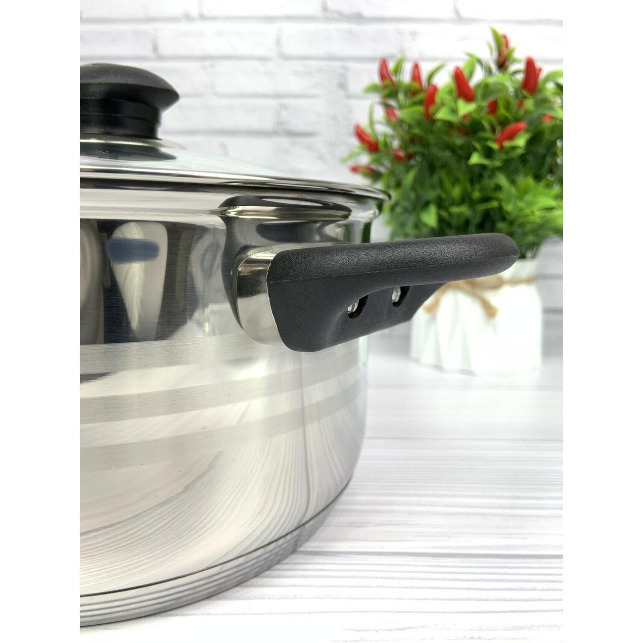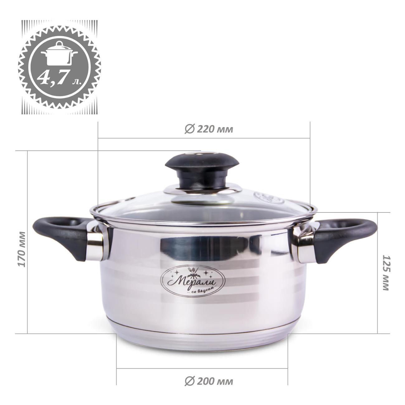 Кастрюля объемом 4,7 литра из нержавеющей стали со стеклянной крышкой 22 см, высота борта 12,5 см с зеркальной полировкой внутри и снаружи. Диаметр дна 20 см.