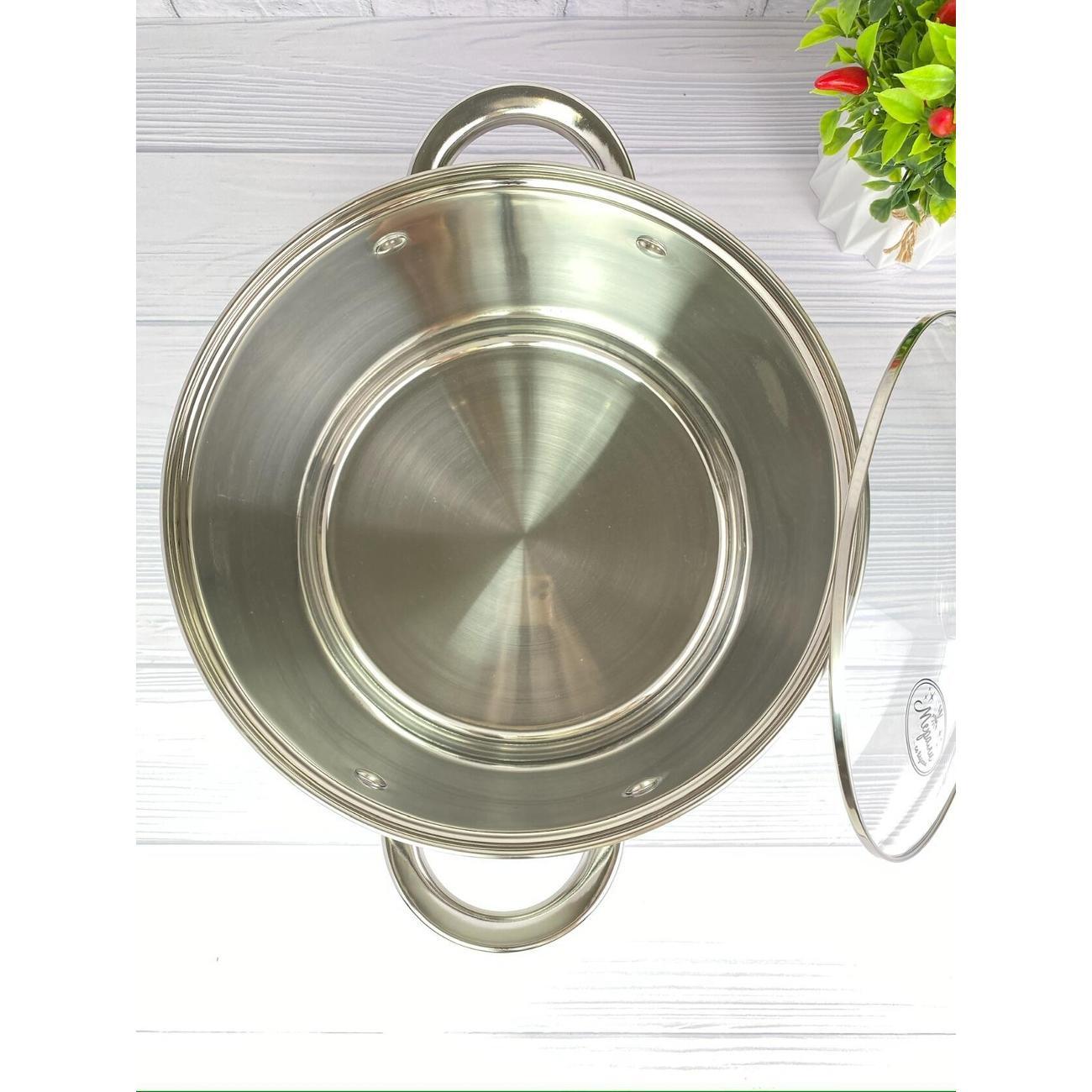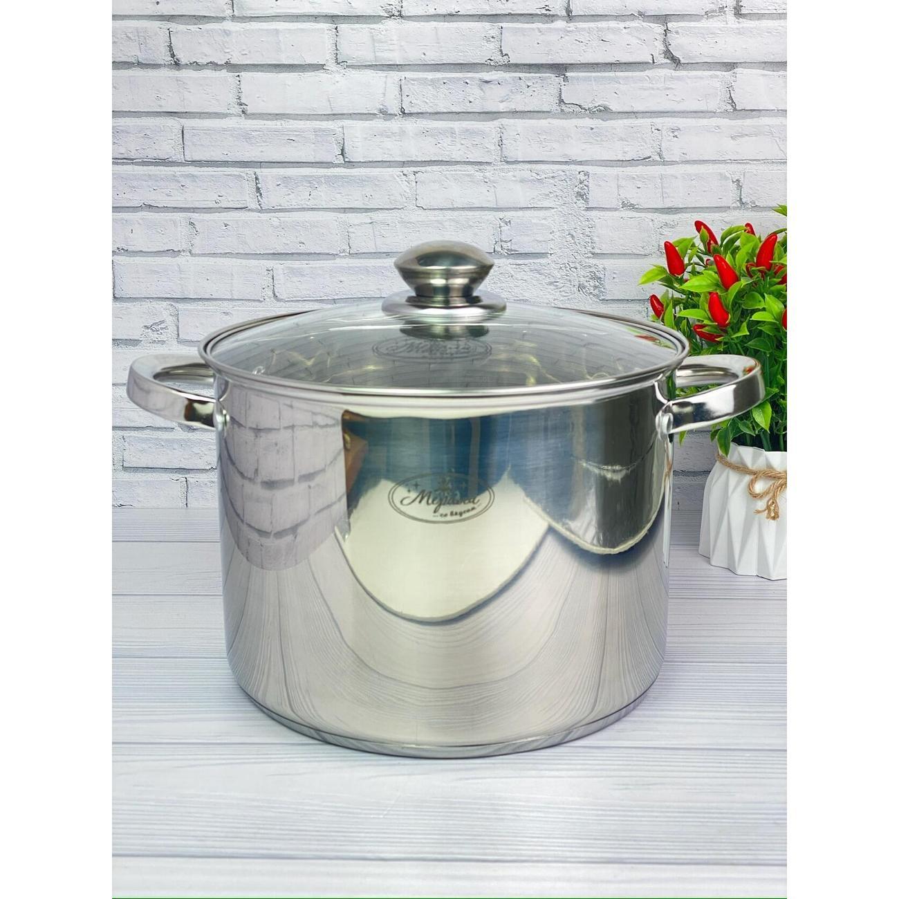 Большая кастрюля Мерали 8 литров из нержавеющей стали со стеклянной крышкой 24 см.С мерной шкалой внутри. Толщина дна 7 мм и стенок 1 мм. Идеальное решение для сезонных заготовок и закруток, больших застолий или просто для большой компании. Преимущество данной посуды - это толстое дно и стенки, клепанные ручки, крышка с металлическим ободком и пароотводом, мерная шкала ну и конечно же большой объем.Утолщенное капсульное дно обеспечивает равномерное распределение тепла и быстрый нагрев содержимого, избегая пригорания пищи.