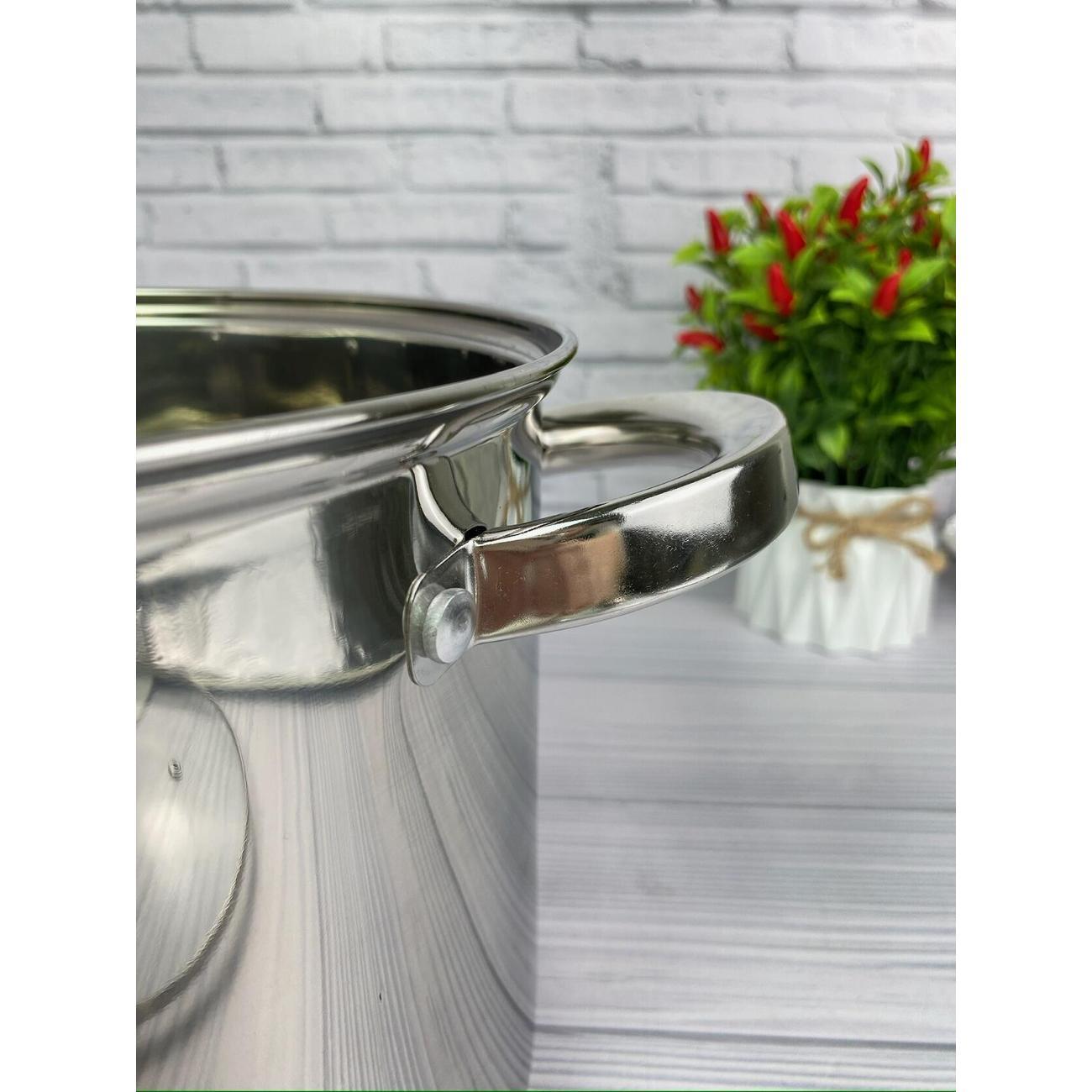 Большая кастрюля Мерали 16 литров из нержавеющей стали со стеклянной крышкой 30 см.С мерной шкалой внутри. Толщина дна 7 мм и стенок 1 мм. Идеальное решение для сезонных заготовок и закруток, больших застолий или просто для большой компании. Преимущество данной посуды - это толстое дно и стенки, клепанные ручки, крышка с металлическим ободком и пароотводом, мерная шкала ну и конечно же большой объем.Утолщенное капсульное дно обеспечивает равномерное распределение тепла и быстрый нагрев содержимого, избегая пригорания пищи.