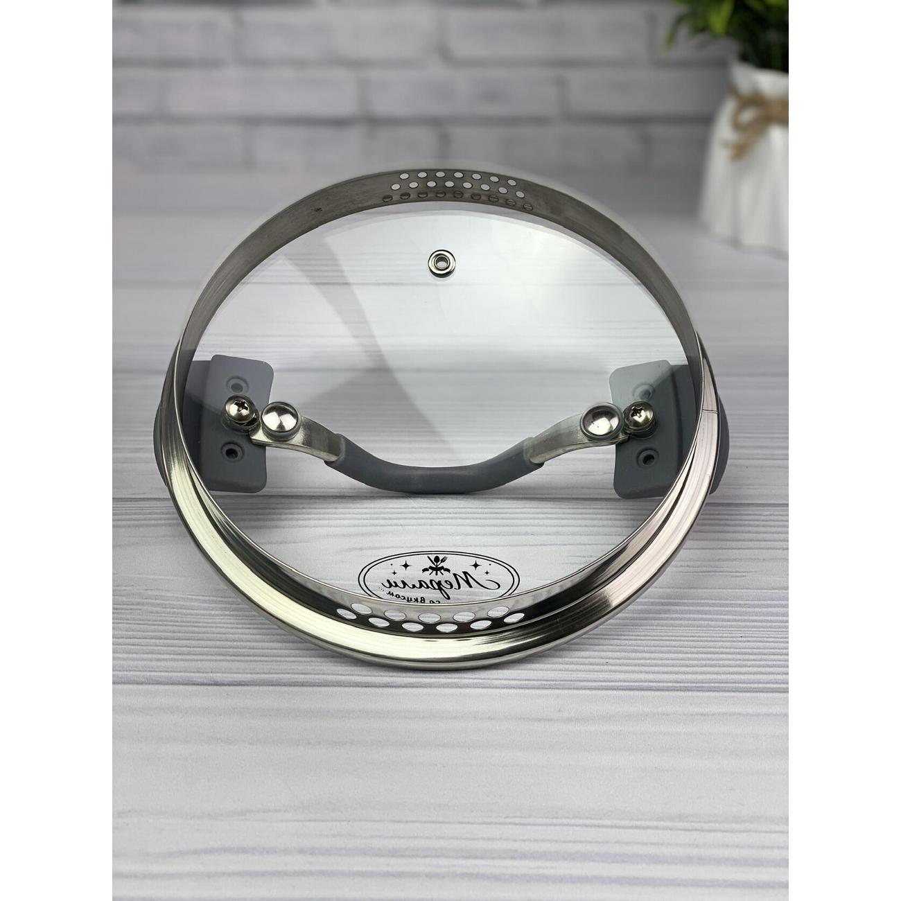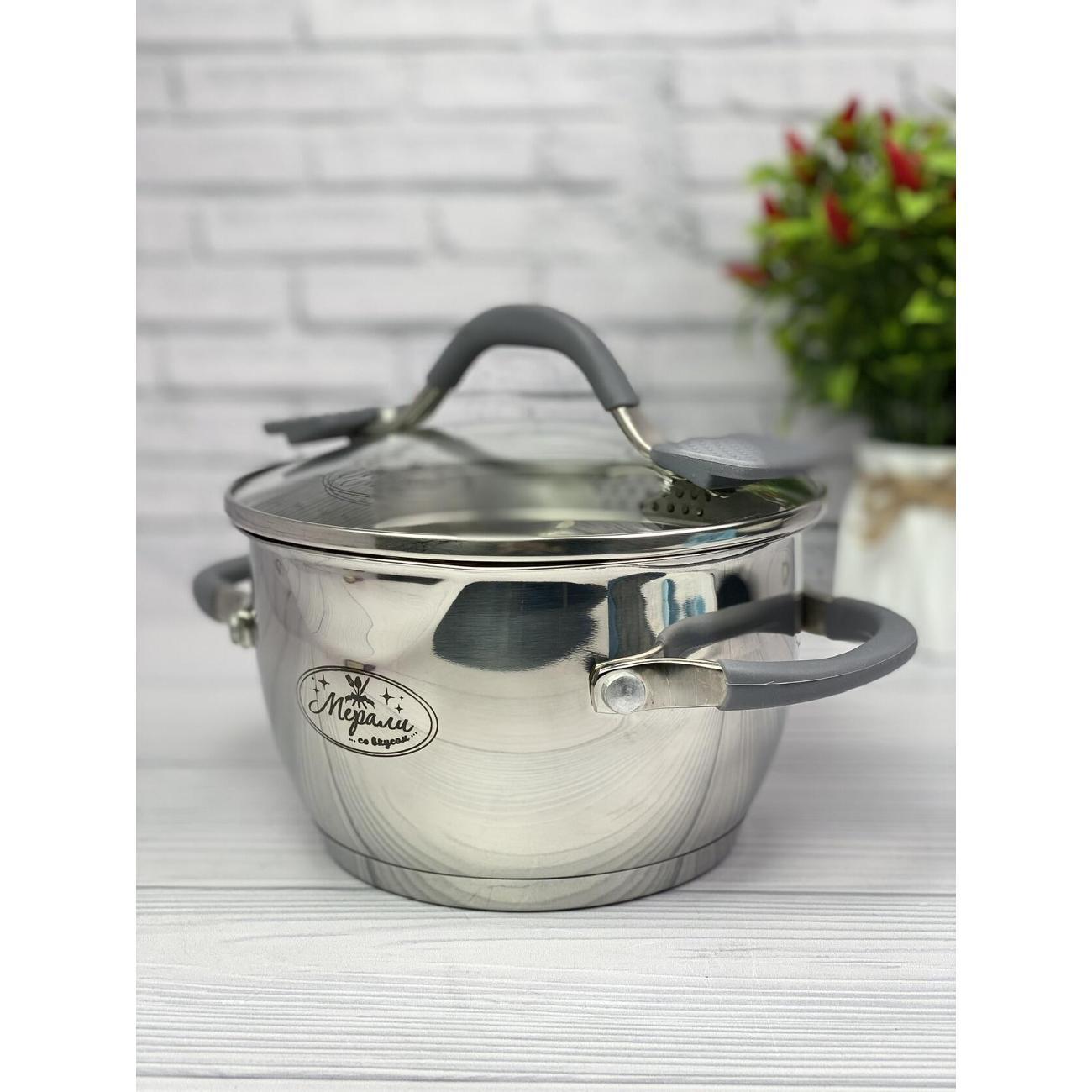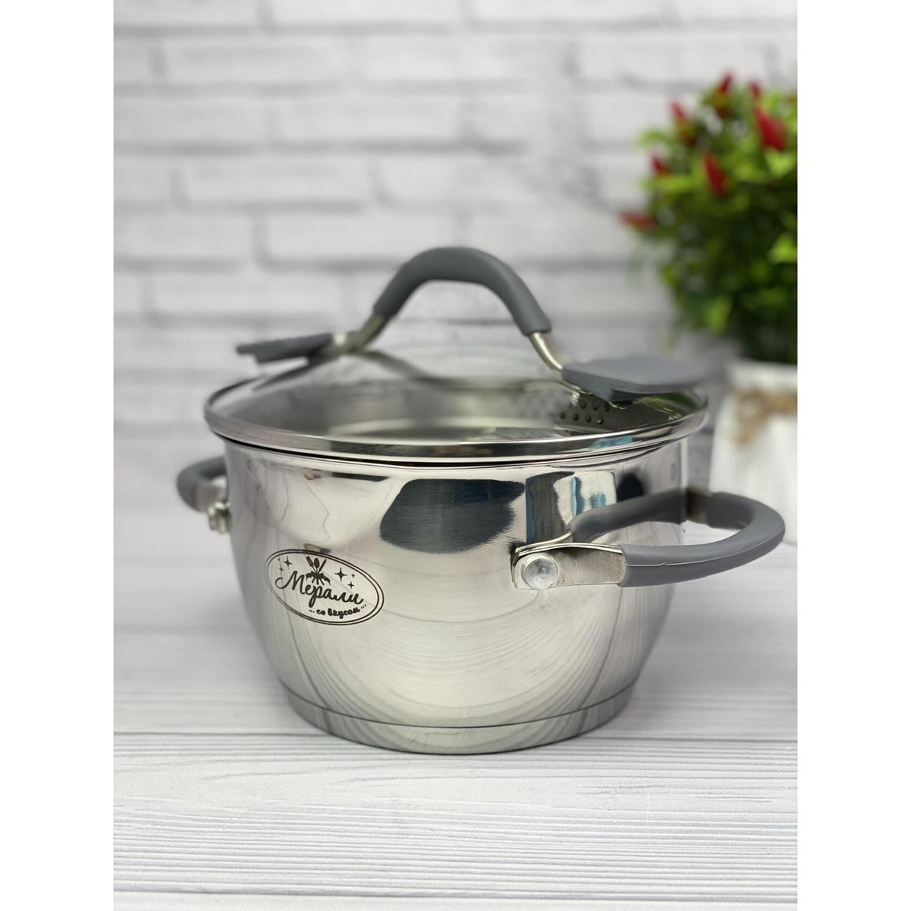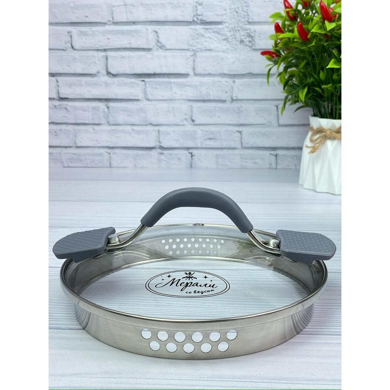 Кастрюля со сливом и крышкой-дуршлаг Мерали 6,3 литра из нержавеющей стали со стеклянной крышкой 24 см, высота борта 22 см.