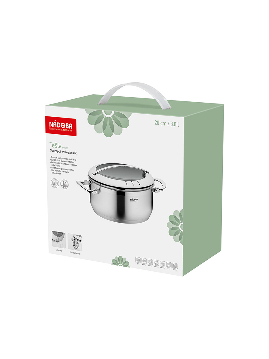 Кастрюля Nadoba 727812, изготовленная из нержавеющей стали высокого качества, устойчива к появлению коррозии. Объем модели составляет 0,9 л. Благодаря трехслойному капсульному дну в 5,1 мм тепло равномерно распределятся по всей поверхности. Толщина стенки равна 0,6 мм. Крышка, выполненная из закаленного стекла, дополнена встроенным дуршлагом. Присутствует внутренняя градуировка, что обеспечивает комфортное использование. Складные ручки позволяют удобно хранить посуду. Она подходит для всех видов плит. Ее можно мыть в посудомоечной машине.