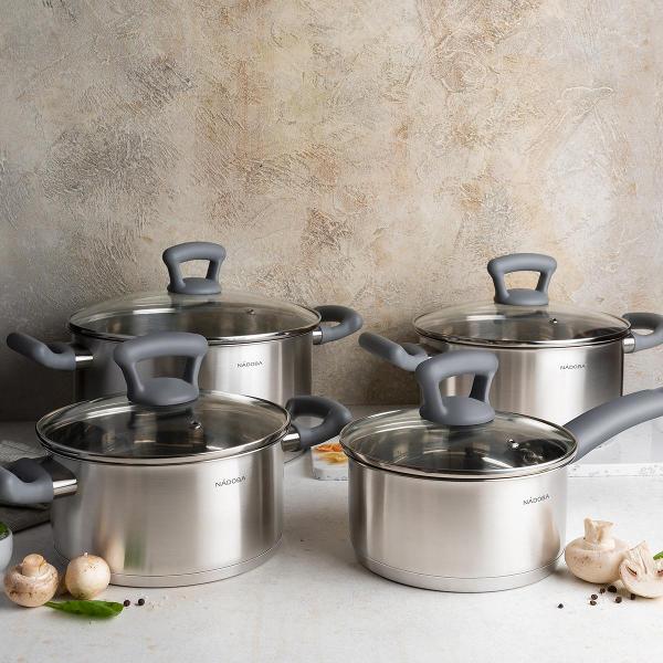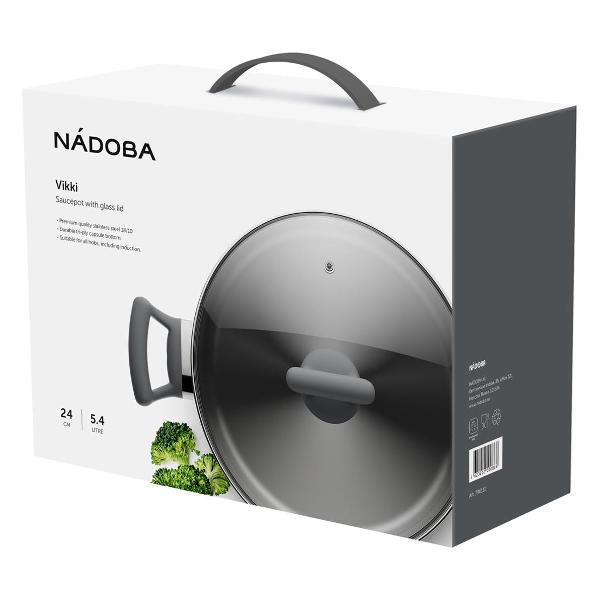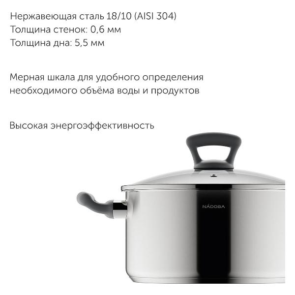 Кастрюля NADOBA со стеклянной крышкой серии Vikki 24 см имеет объем 5,4 литра.