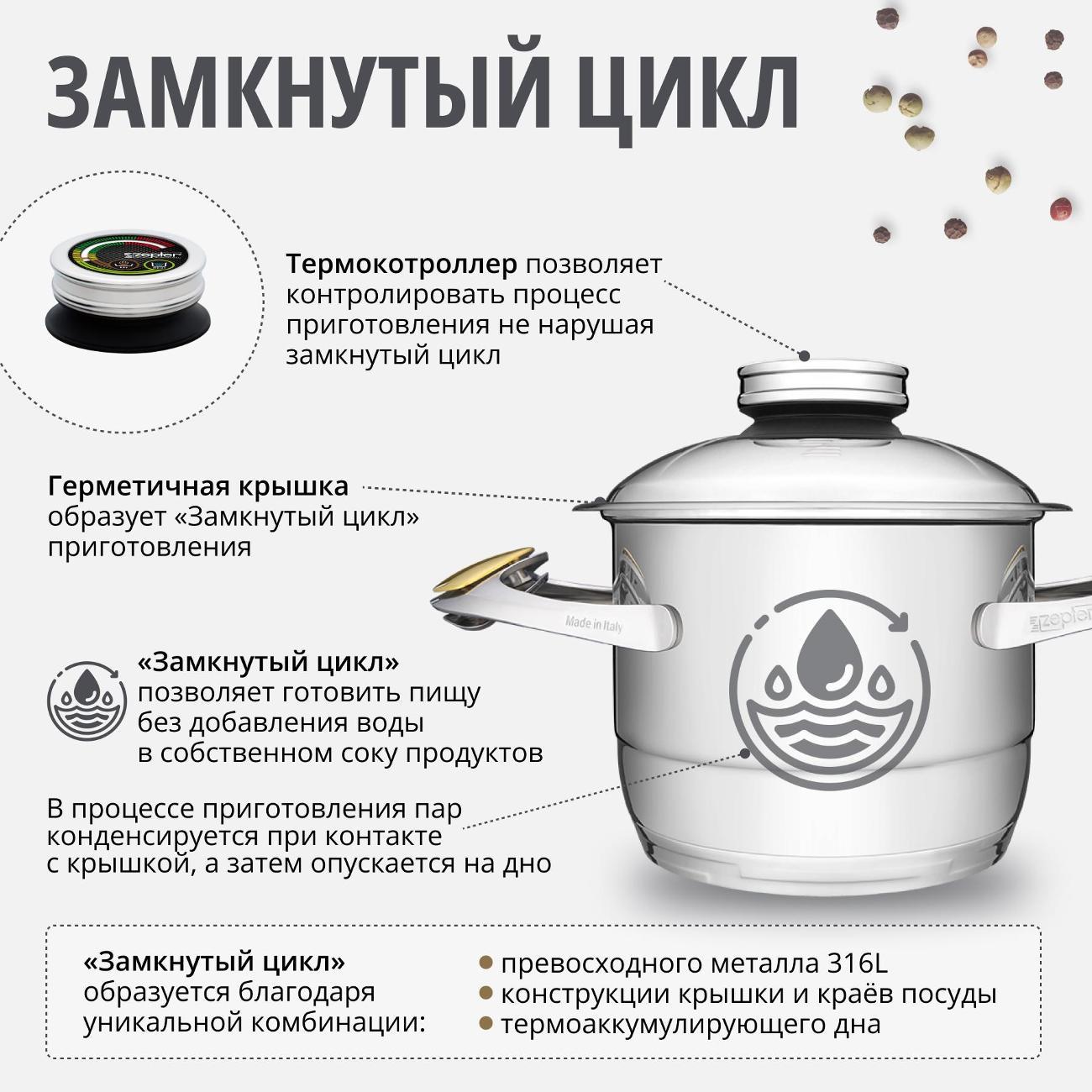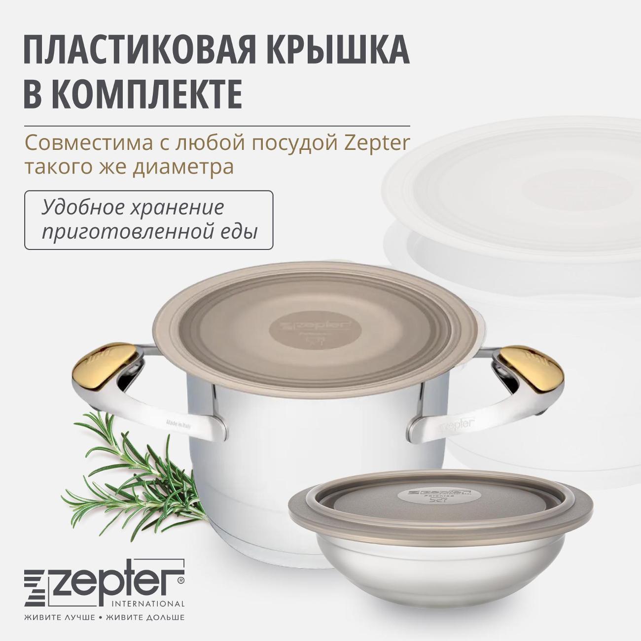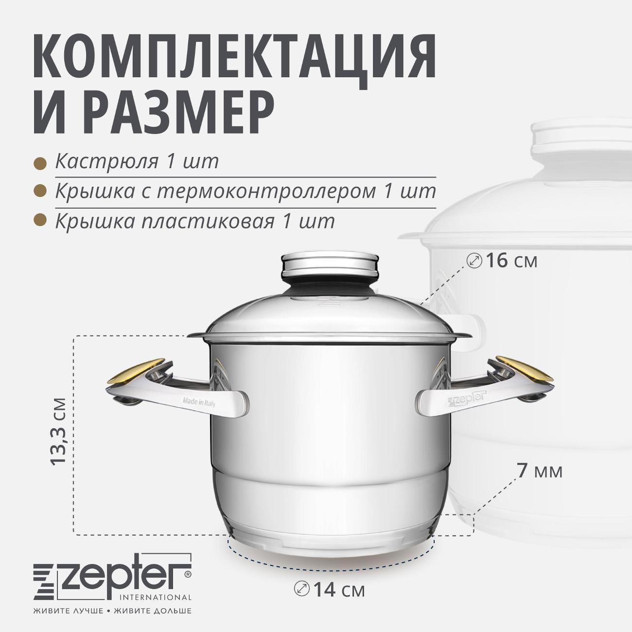 Серебристая кастрюля Zepter Z-1625 диаметром 16 см вмещает 2,5 л. Стальная модель дополнена термоизолированной ручкой золотистого цвета. Многослойное термораспределительное дно обеспечивает равномерный нагрев. В комплект входит крышка с датчиком тепла, которую можно использовать в качестве подставки. Подходит для всех видов варочных поверхностей, духового шкафа и чистки в посудомоечной машине. С помощью кастрюли можно варить влагосодержащие продукты без воды. Перед применением необходимо расконсервировать средством TFD-942.