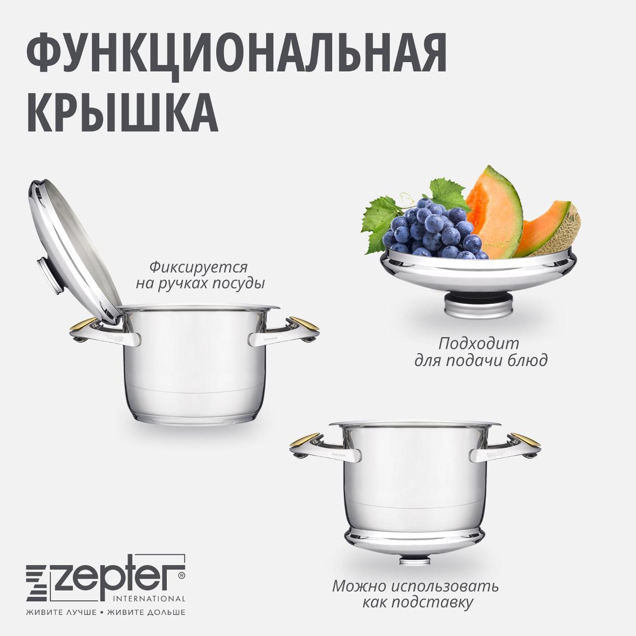 Серебристая кастрюля Zepter Z-2042 диаметром 20 см вмещает 4,2 л. Стальная модель дополнена термоизолированной ручкой золотистого цвета. Многослойное термораспределительное дно обеспечивает равномерный нагрев. В комплект входит крышка с датчиком тепла, которую можно использовать в качестве подставки. Подходит для всех видов варочных поверхностей, духового шкафа и чистки в посудомоечной машине. С помощью кастрюли можно варить влагосодержащие продукты без воды. Перед применением необходимо расконсервировать средством TFD-942.