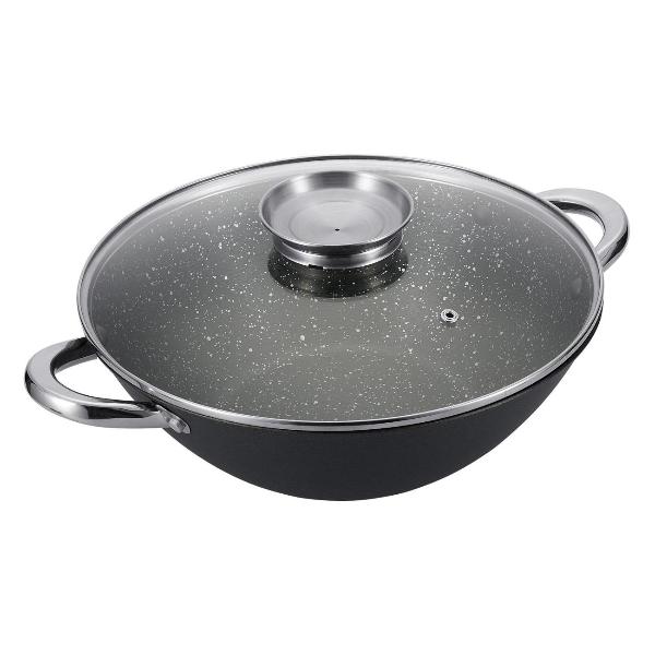 В комплекте с казаном идет стальная решетка для блюд на пару, лопатка эргономичной формы и пара кулинарных бамбуковых палочек.