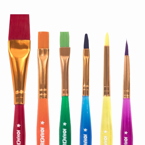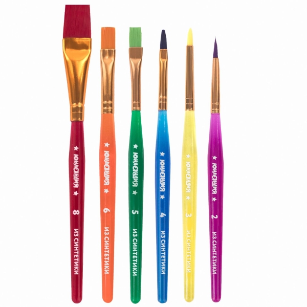 Набор «Юнландия» состоит из шести кистей из синтетического ворса: круглых №2 и 3 и плоских №4, 5,6 и 8. Они оснащены укороченными ручками, предназначены для детского творчества в школе и дома и позволяют решать разные художественные задачи: делать крупные мазки и линии и прорисовывать мелкие детали.