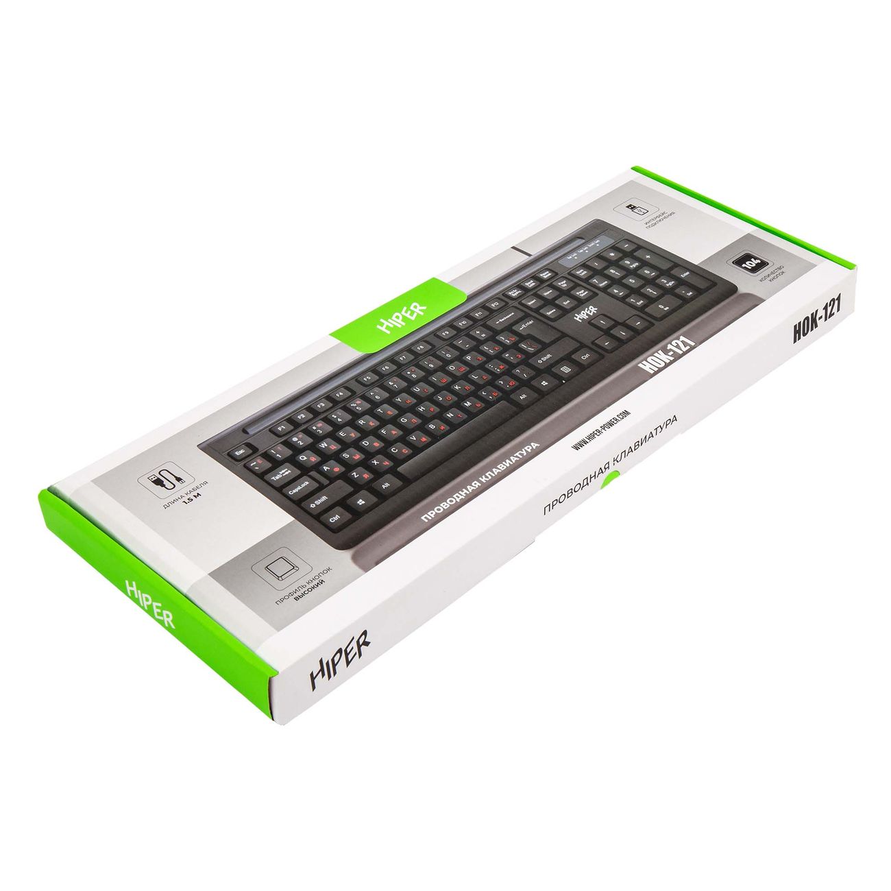 Проводная клавиатура Hiper HOK-121 полноразмерного типа оснащена 104 клавишами. За счет мембранного основания гарантируется легкость нажатия. Раскладка на английском языке выполнена в белом цвете, на русском — в красном. Корпус произведен из пластика.